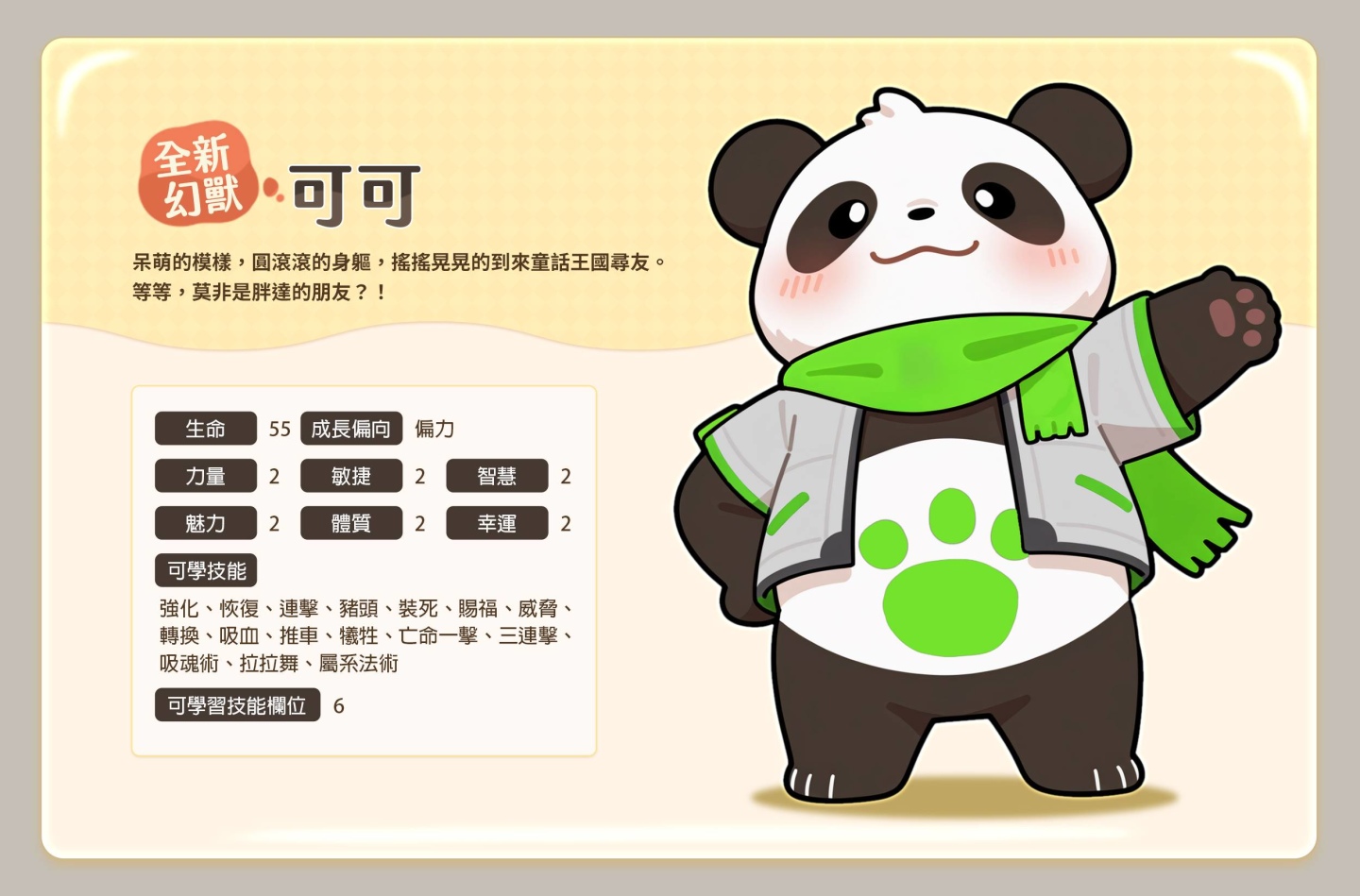 屬性 : 光 生命 : 55 力量 : 2 敏捷 : 2 智慧 : 2 魅力 : 2 體質 : 2 幸運 : 2 可學技能 : 強化、恢復、連擊、豬頭、裝死、賜福、威脅、轉換、吸血、推車、犧牲、亡命一擊、三連擊、吸魂術、拉拉舞、光系法術 可學習技能欄位 : 6 備註:特殊稀有幻獸,遊戲中無管道取得,不可融合,唯一屬性絕版寵 |