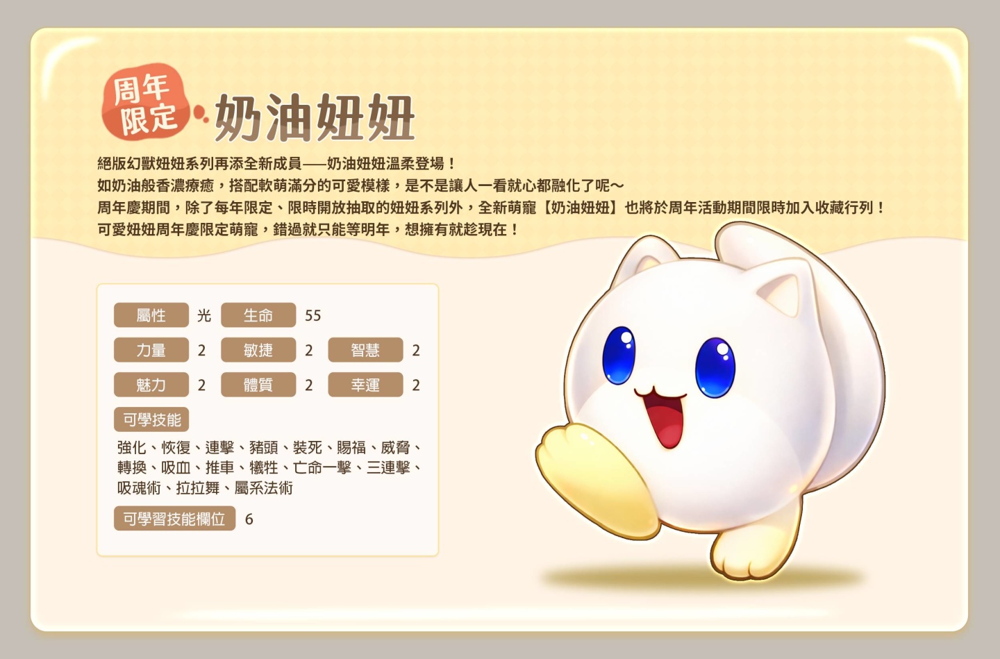 絕版幻獸妞妞系列再添全新成員——奶油妞妞溫柔登場!如奶油般香濃療癒,搭配軟萌滿分的可愛模樣,是不是讓人一看就心都融化了呢~週年慶期間,除了每年限定、限時開放抽取的妞妞系列外,全新萌寵【奶油妞妞】也將於週年活動期間限時加入收藏行列!可愛妞妞週年慶限定萌寵,錯過就只能等明年,想擁有就趁現在!