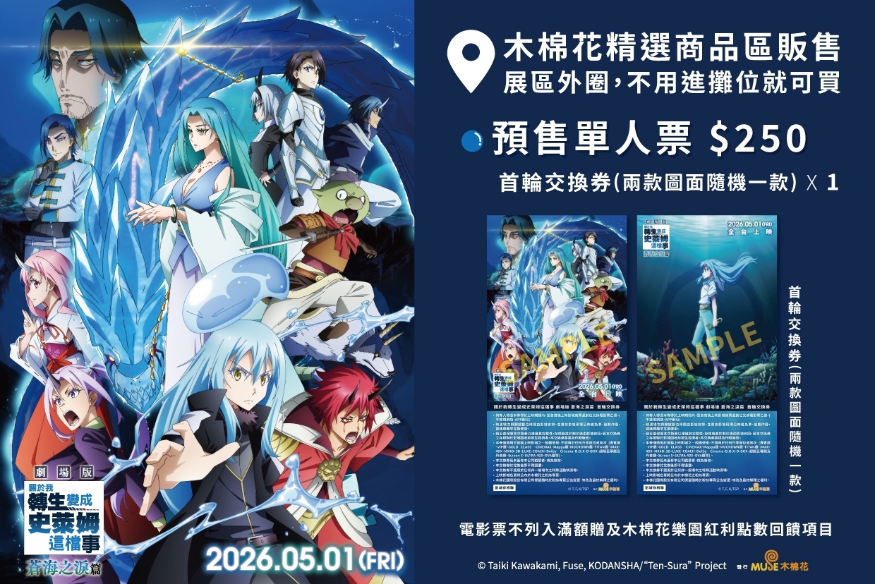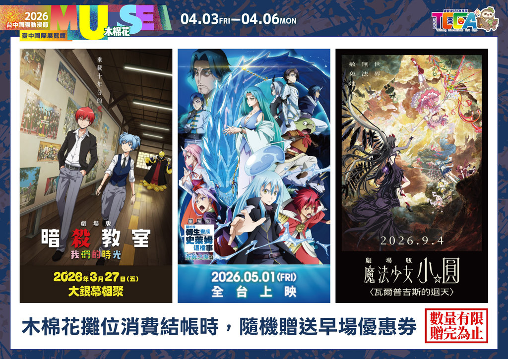 此外,現場的攤位外圍精選商品區還會販售《關於我轉生變成史萊姆這檔事 劇場版 蒼海之淚篇》的預售單人票;在木棉花攤位消費結帳時,更能隨機獲得《劇場版「暗殺教室」:我們的時光》、《關於我轉生變成史萊姆這檔事 劇場版 蒼海之淚篇》,以及《劇場版 魔法少女小圓〈瓦爾普吉斯的迴天〉》三部電影的早場優惠券。這個春天,最豐富最超值的動畫商品及優惠活動,就在2026台中國際動漫節的木棉花攤位,錯過絕對可惜!