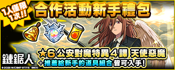 購買「動畫《鏈鋸人》第2彈合作活動新手禮包」,就能以運氣5&等級「極」&「+值」MAX狀態獲得「公安對魔特異4課天使惡魔(★6)」。此外,還能獲得任選鈴及體力罐等推薦給新手的道具組合!「公安對魔特異4課天使惡魔」只能透過合作活動新手禮包入手,每人限購1次!此外可獲得第1彈合作活動角色「公安對魔特異4課領導者真紀真(★6)」的合作活動新手禮包也會再度登場!