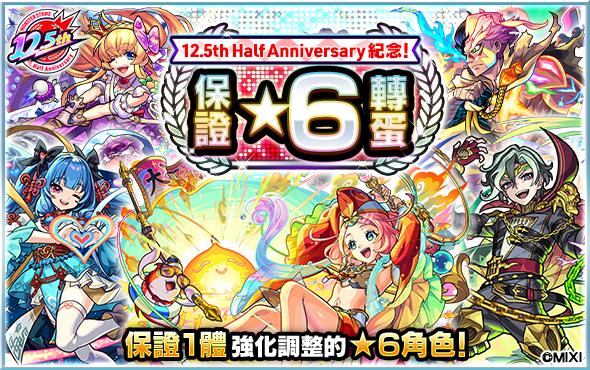 除此之外,以「惠比壽」為首,「羅拔」「芙蕾雅」「不可思議」「神帝史特萊克」「愛麗絲」等多位角色也於3月28日進行了強化!「12.5th Half Anniversary紀念!保證★6轉蛋」也已開跑!從合計25體強化調整後的轉蛋角色中,保證轉出1體★6角色!千萬不要錯過!
