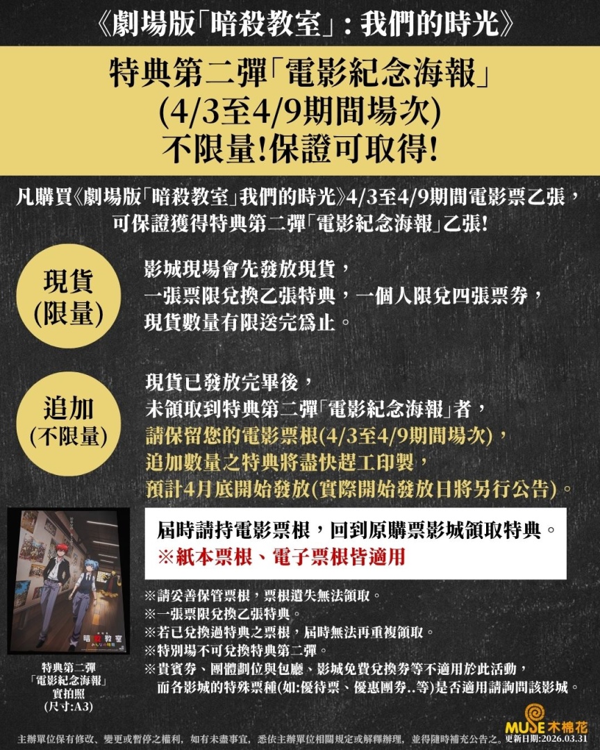 第二週入場特典 A3「電影紀念海報」同步公開。4 月 3 日至 4 月 9 日活動期間,持《劇場版「暗殺教室」:我們的時光》電影票,即可至原購票影城兌換乙份特典。如遇特典發放完畢而尚未領取之觀眾,請務必保留票根,特典發放相關資訊將另行於木棉花社群公告。
