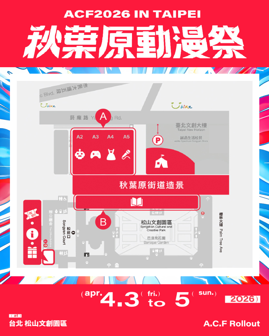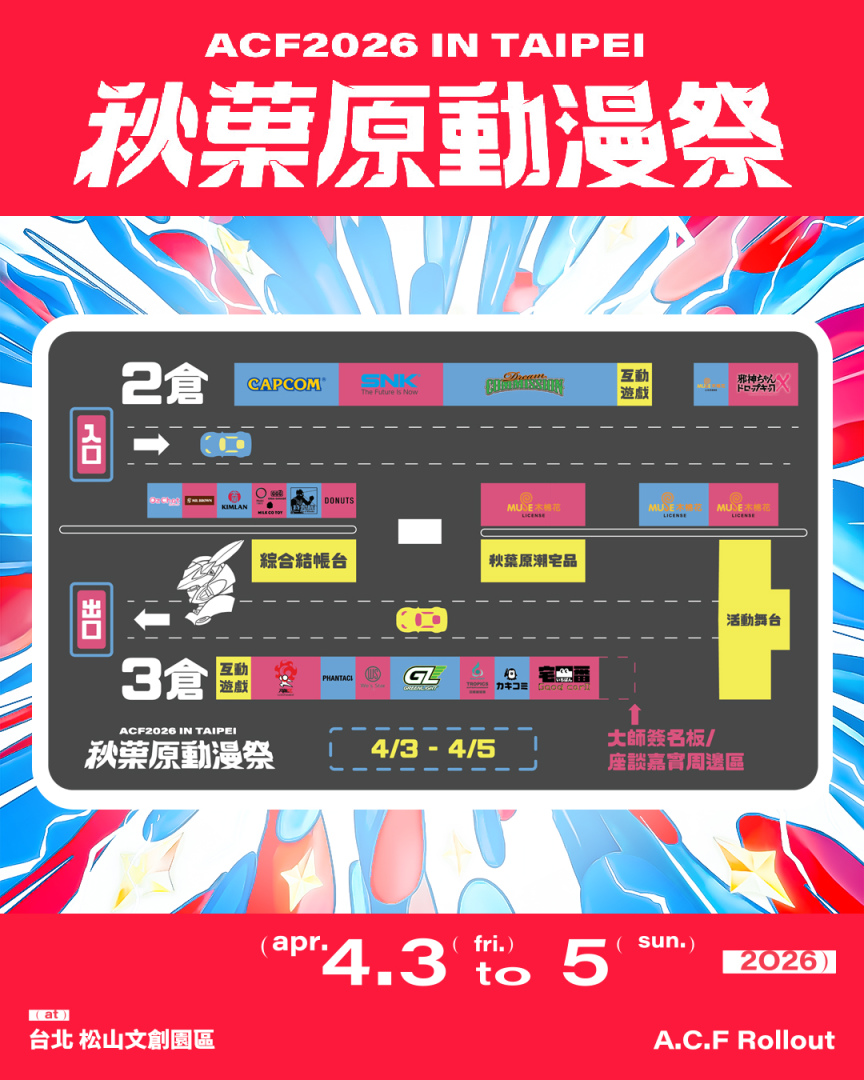 萬眾矚目的「2026 A.C.F 秋葉原動漫祭 in TAIPEI」將於4月3日至4月5日在台北松山文創園區全力出動。官方為主要活動的五大展區設計了代表角色,概念是把ACG文化中不同的元素擬人化,讓每一個倉不只是展區,而是一連串來自「創作、玩家、收藏、舞台到秋葉原文化」的重要組成,同時更期待透過擬人化的方式,讓大家在活動中感受到動漫世界的熱血與魅力!