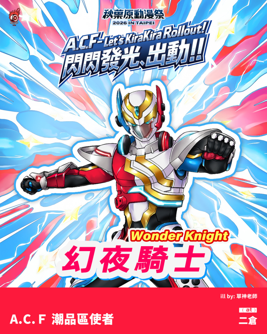 「Wonder Knight 幻夜騎士」角色概念來自特攝英雄文化,造型靈感結合遊戲手把元素,象徵模型、潮流玩具與日本英雄文化,像是動漫世界中的熱血守護者。由草神老師設計。草神是台灣知名機甲創作者與裝甲設計師,長期投入自製機甲與特攝風格裝備製作,以高度細節與機械美學聞名,是台灣少見能將機甲設計實體化的創作者之一。