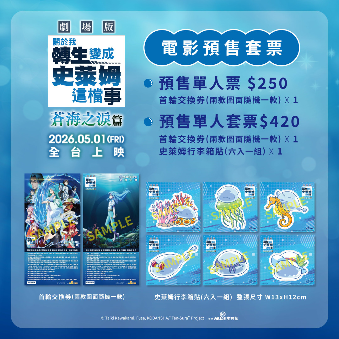異世界轉生經典作品《關於我轉生變成史萊姆這檔事》第四季動畫將在4月3日開播,而粉絲敲碗已久的《關於我轉生變成史萊姆這檔事 劇場版 蒼海之淚篇》更將在5月1日全台盛大上映!日前預售票以及預售票套組已於4月1日在博客來、金石堂網路書店、買動漫、安利美特、木棉花實體門市(台北/台中/高雄)正式發售,預售套組內容包含《關於我轉生變成史萊姆這檔事 劇場版 蒼海之淚篇》電影預售票 1 張,以及全新電影限定的史萊姆行李箱貼紙組6入組,售價 420 元,數量有限,售完為止,喜愛史萊姆的粉絲們請把握時間搶購。