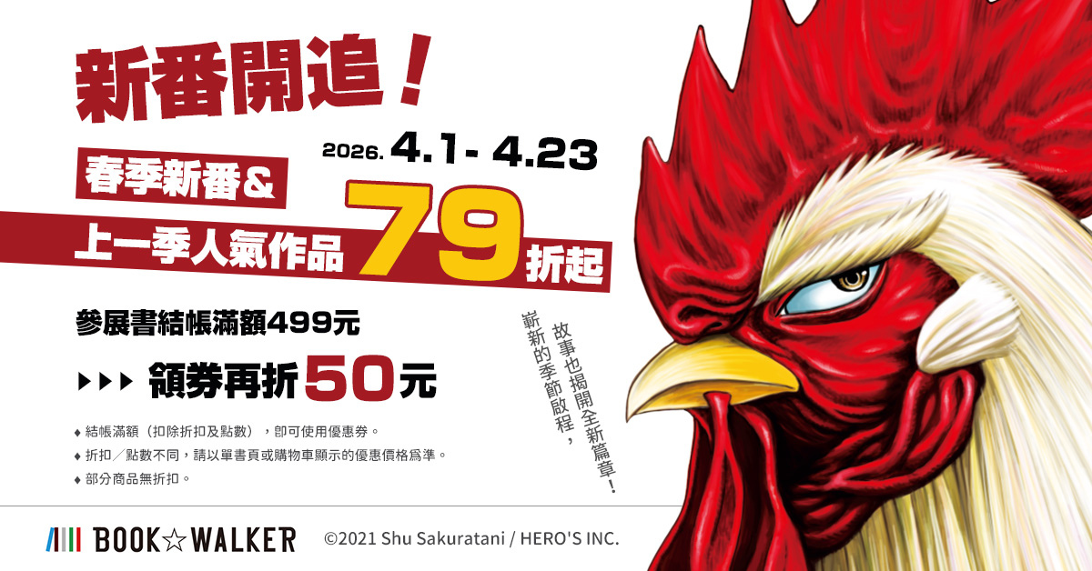 隨著動畫新番陸續開播,想一睹原作風采的讀者也別錯過「新番開追!春季新番&上一季人氣作品書展」。即日起至4月23日,參展作品79折起,活動頁同步可領取50元優惠券。參展作品包括描述了一隻雞拯救人類故事的《雞鬥士》、以女高中生挑戰傳統藝能界為主軸的《朱音落語》,以及喚醒前世偉人才能的《輪迴的花瓣》等精彩故事。