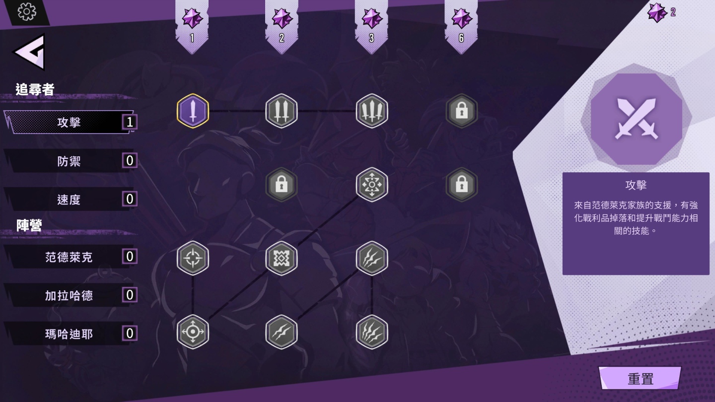 除了關卡內容的強化外,提供玩家局外成長的天賦系統也同步開放測試。要開啟天賦系統,玩家需要至少擊敗一名關卡中的英雄怪物,之後就能從標題畫面進入天賦介面。在天賦系統中,玩家將可以選擇不同的訓練路線,去強化英雄在攻擊、防禦和速度等方面的屬性;並能透過投入點數在范德萊克、加拉哈德與瑪哈迪耶三大陣營的不同分支中,去獲得專屬於該陣營的強大助力。