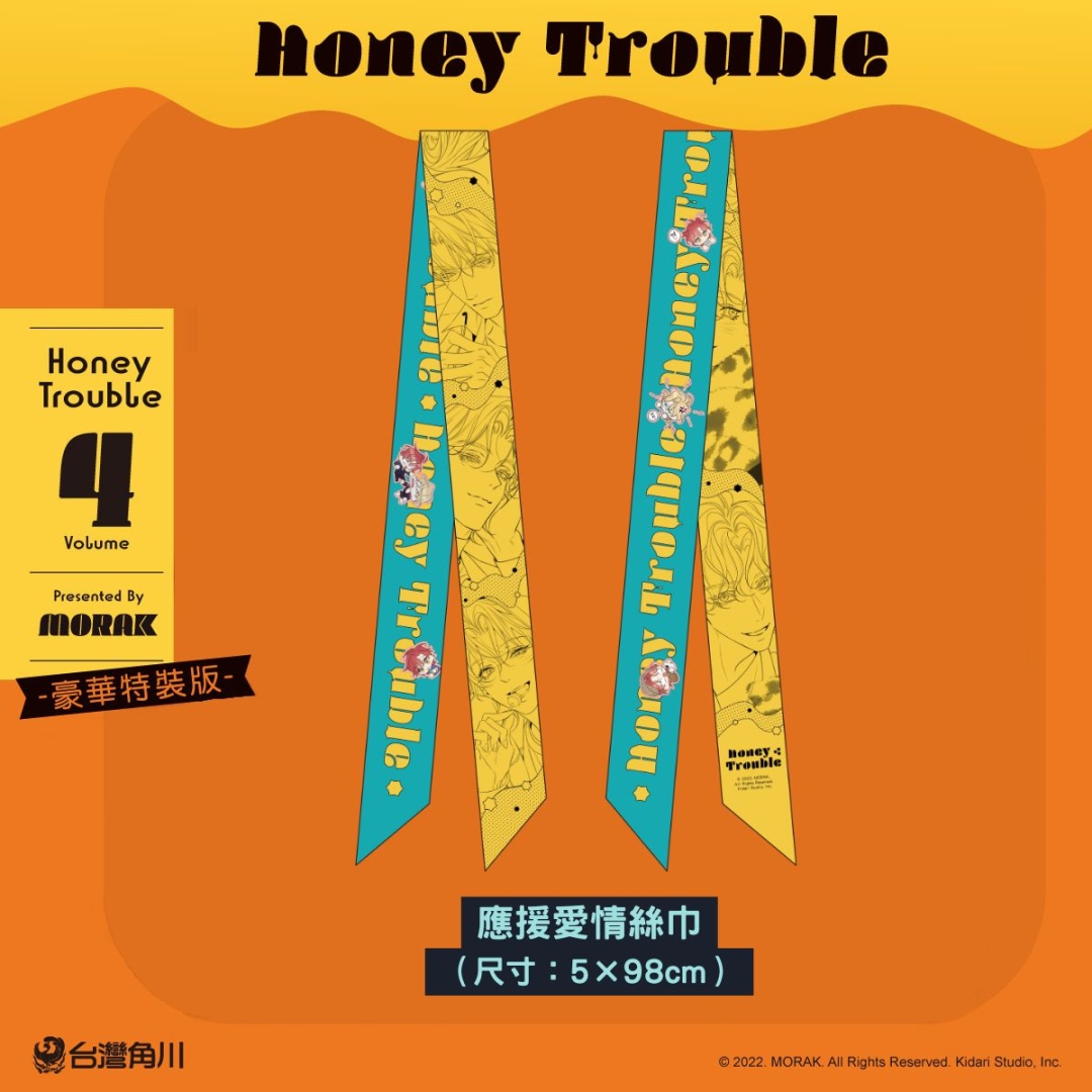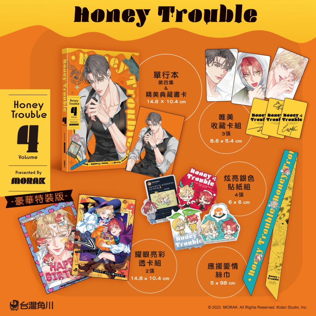 《Honey Trouble 4》豪華特裝版收錄豐富周邊,包括「漫畫單行本第四集(附精美典藏書卡)」;尹至軒生日主題與兩人幼時可愛萬聖節造型的「耀眼亮彩透卡組」;適合裝飾在手機背面的四入Q版「炫亮銀色貼紙組」;可點綴在痛包上的「應援愛情絲巾」,以及雙面設計、背面附印刷簽名的「唯美收藏卡組」,以上精緻內容皆完整收納於「特裝版珍藏書盒」中。豪華特裝版將於4/15(三)正式開放預購,有興趣的粉絲務必把握機會!