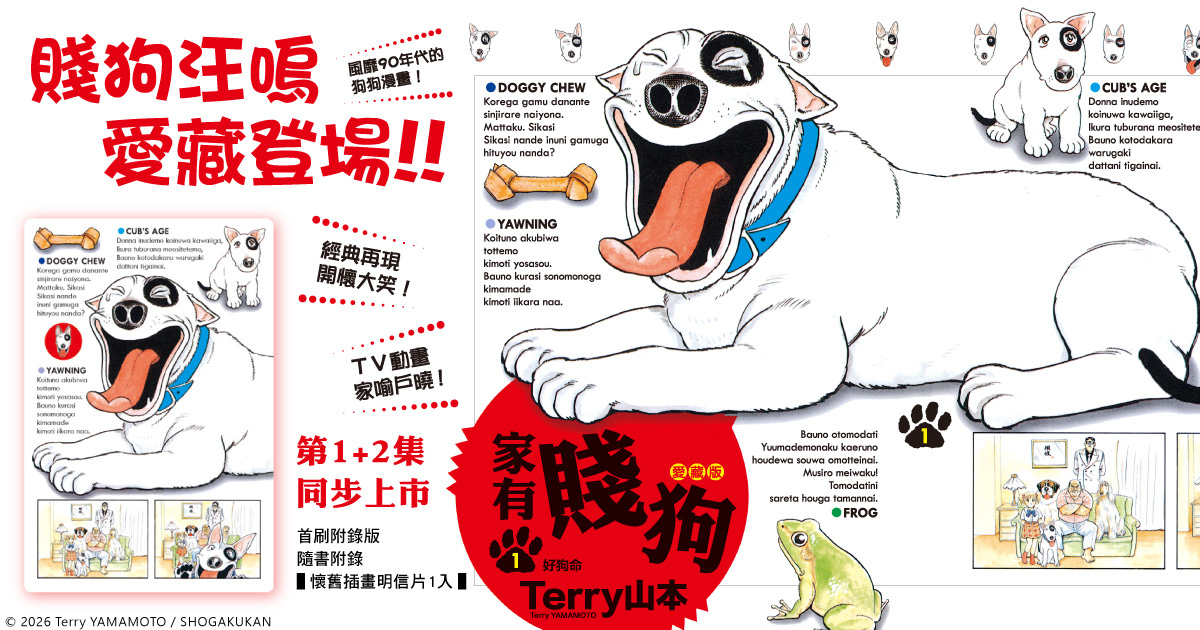 《家有賤狗 愛藏版》第1集、第2集首刷附錄版已於4月10日同步上市!本次東立出版社推出的愛藏版預計共11集,每集隨書附錄懷舊插畫明信片1入!喜歡搞怪又好笑的賤狗汪嗚的書迷讀者們,請一定要將這部經典之作收藏起來!
