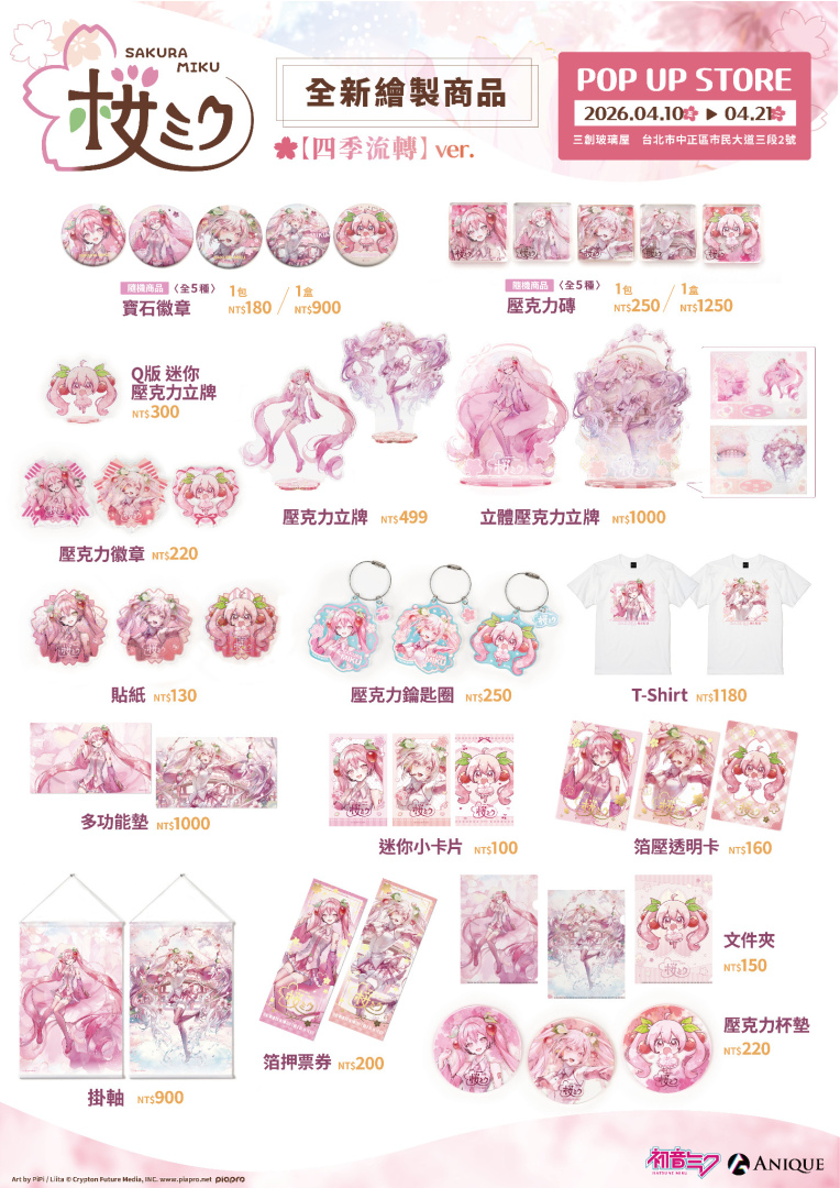 ANIQUE 持續與日本知名繪師 PiPi、梨伊荼攜手合作,兩位繪師以不同風格但同樣細膩的筆觸,展現出初音未來不同面貌下的獨特魅力。現場備有多款全新繪製的周邊,讓大家在暖心春日裡盡情選購!