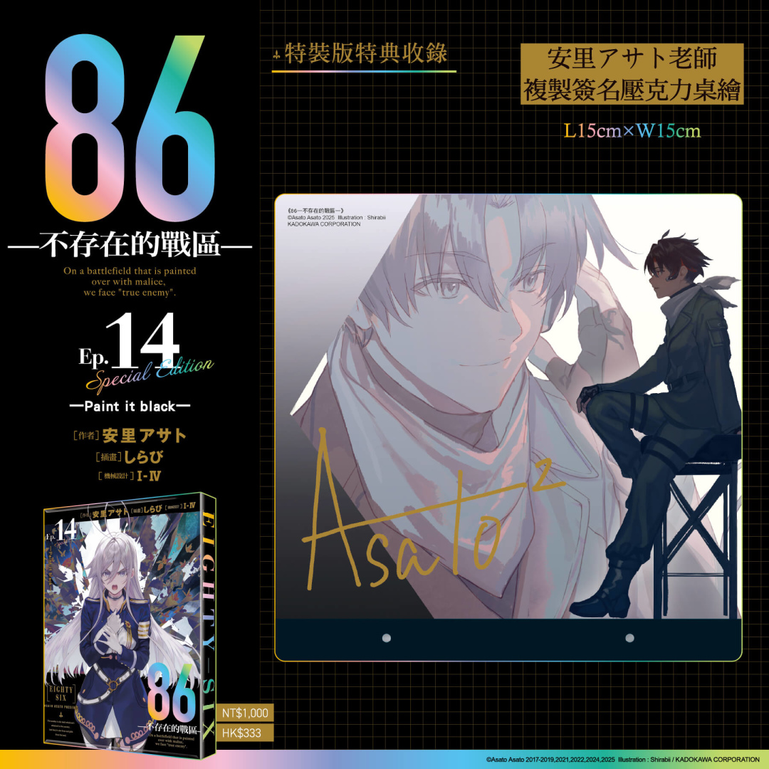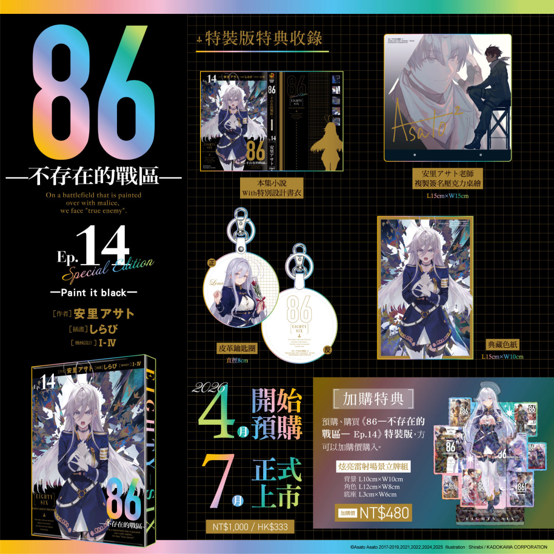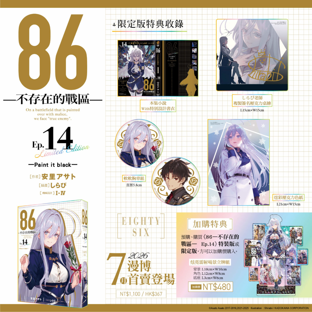 《86─不存在的戰區─(Ep.14)》特別規劃限定版與特裝版,打造豪華雙版本周邊:【特裝版】開放指定通路&台灣角川官網預購/販售,2026漫畫博覽會首賣登場──收錄「安里アサト老師複製簽名壓克力桌繪」、「典藏色紙」、「皮革鑰匙圈」;【限定版】將於2026漫畫博覽會獨家首賣,台灣角川官網限定發售──收錄「しらび老師複製簽名壓克力桌繪」、「炫彩壓克力色紙」、「軟軟胸章組 (2入) 」;雙版本皆收錄「本集小說 with 特別設計書衣」於黑白兩款絕讚設計的「特製珍藏書盒」中。