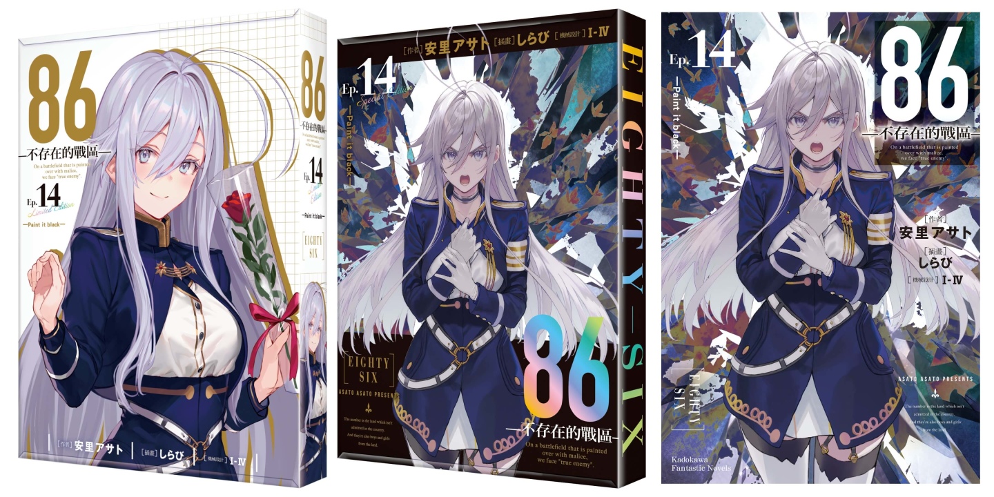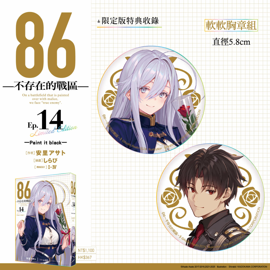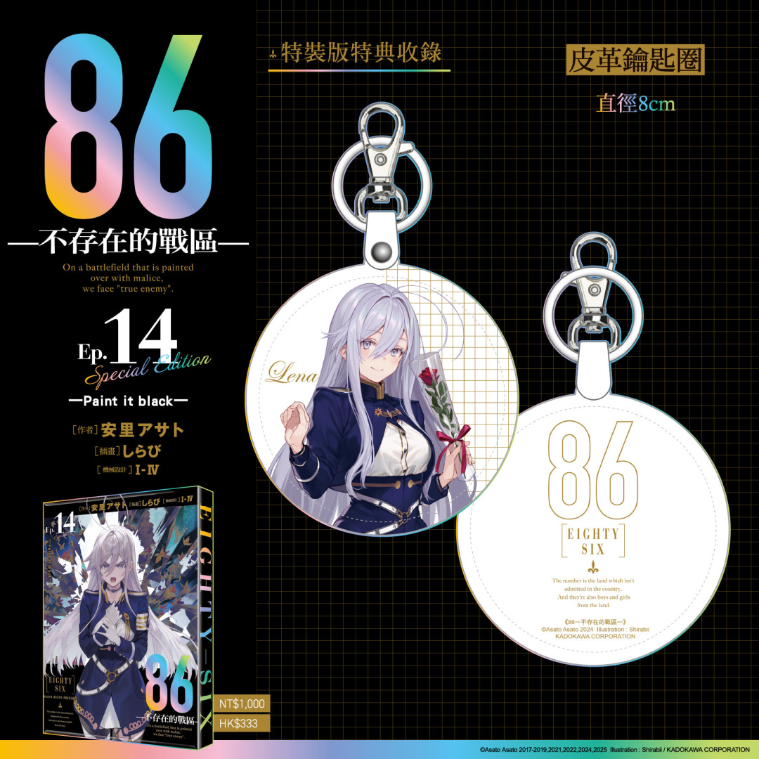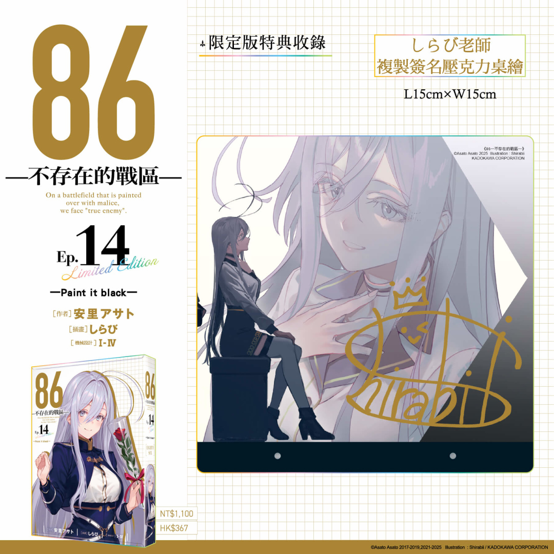 《86─不存在的戰區─(Ep.14)》特別規劃限定版與特裝版,打造豪華雙版本周邊:【特裝版】開放指定通路&台灣角川官網預購/販售,2026漫畫博覽會首賣登場──收錄「安里アサト老師複製簽名壓克力桌繪」、「典藏色紙」、「皮革鑰匙圈」;【限定版】將於2026漫畫博覽會獨家首賣,台灣角川官網限定發售──收錄「しらび老師複製簽名壓克力桌繪」、「炫彩壓克力色紙」、「軟軟胸章組 (2入) 」;雙版本皆收錄「本集小說 with 特別設計書衣」於黑白兩款絕讚設計的「特製珍藏書盒」中。