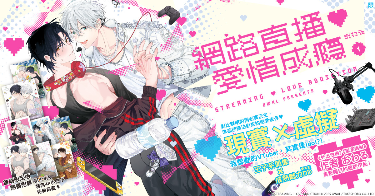 作者おわる老師曾出版過《蜜室逃脫》、《淫魔送上門》、《外出危機》等知名作品,筆下人物充滿帥氣、可愛、性感等不同魅力,其畫技穩定、純熟,且擅長打造生動活潑的劇情,讓人閱讀作品時總能放鬆並投入其中。おわる老師在日本與台灣皆有一票忠實讀者,作品也經常獲得「Chil Chil」BL大賞的肯定,東立更曾於2017年以《誤會是戀愛的種子》邀請老師來台舉辦簽名會!而今天介紹的Vtuber BL作品,則是おわる的最新連載——《網路直播♡愛情成癮》!