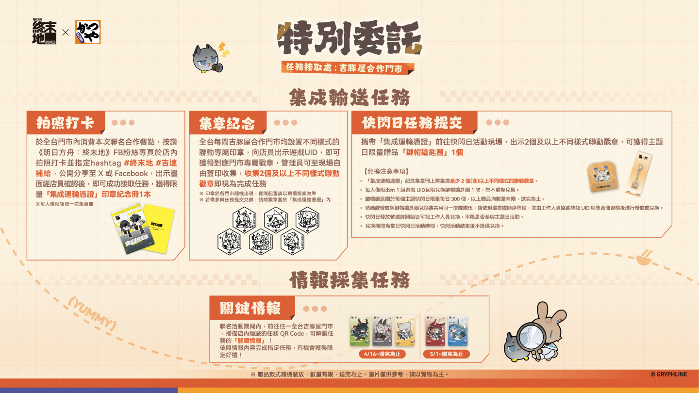 玩家於合作門市內消費本次聯名餐點並完成指定條件後,即可領取限量「集成運輸憑證」紀念集章冊。各門市設有不同聯動印章,出示遊戲UID後可進行蓋章蒐集,集滿2款以上印章即視為完成任務。完成後可於快閃主題日現場兌換限量「鍵帽鑰匙圈」。
