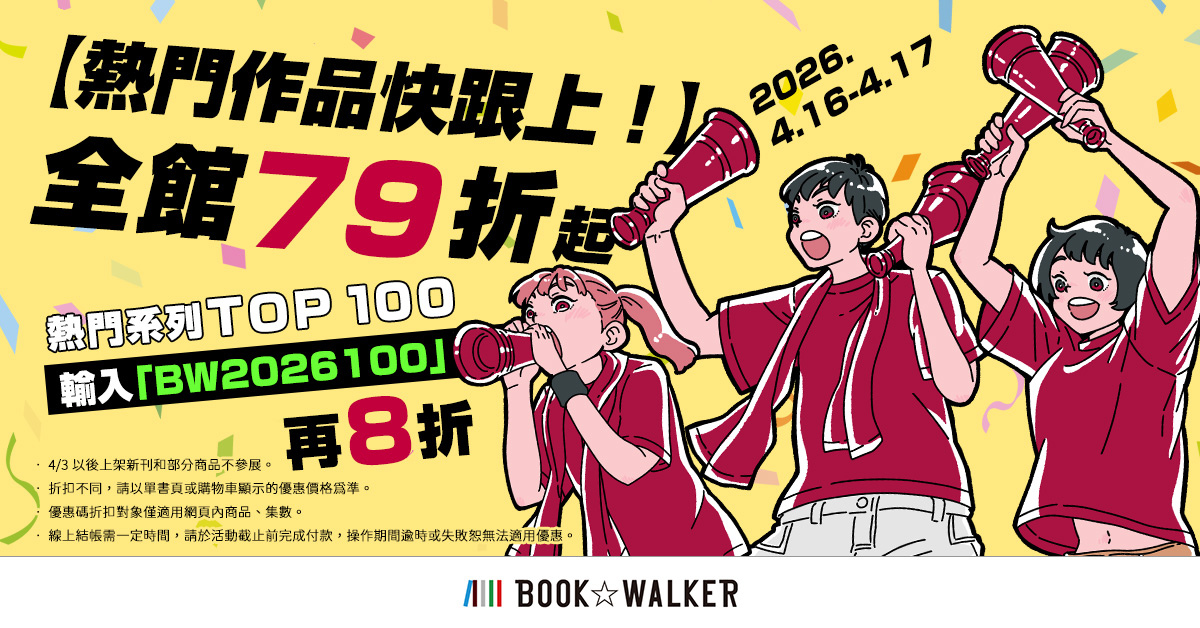 本次最超值的限時優惠活動來啦!活動期間4月16日至4月17日,BOOK☆WALKER 推出全館79折起,熱門系列TOP100輸入「BW2026100」再享8折。隨著春季新番陸續開播,正是一次收藏原作漫畫、輕小說的最佳時機,千萬別錯過!