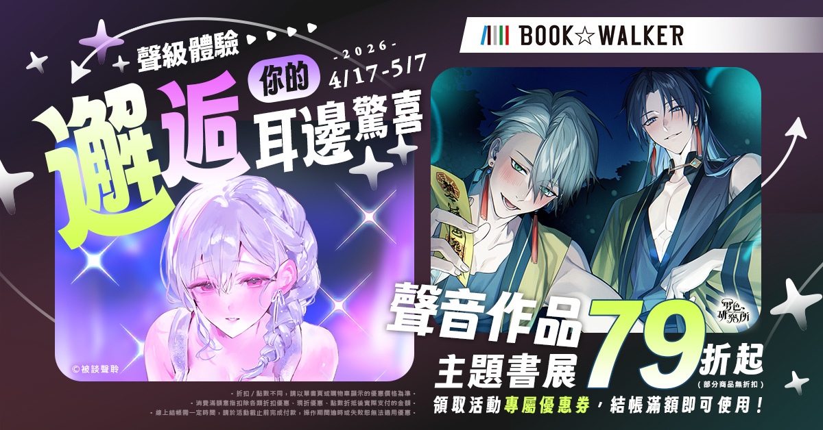 快來邂逅你的耳邊驚喜!4月17日至5月7日,BOOK☆WALKER聲音作品主題書展限時登場,全館79折起,並可領取活動專屬優惠券,結帳滿額最高再折50元!無論是台灣耽美原創《我的網紅男友》、酥麻警告ASMR《遇見溫柔的她然後就戀愛了》、人氣廣播劇《封靈特優生》,以及各式各樣的實用文學有聲書,一次滿足你的聆聽需求,隨時沉浸在專屬聲音世界中!
