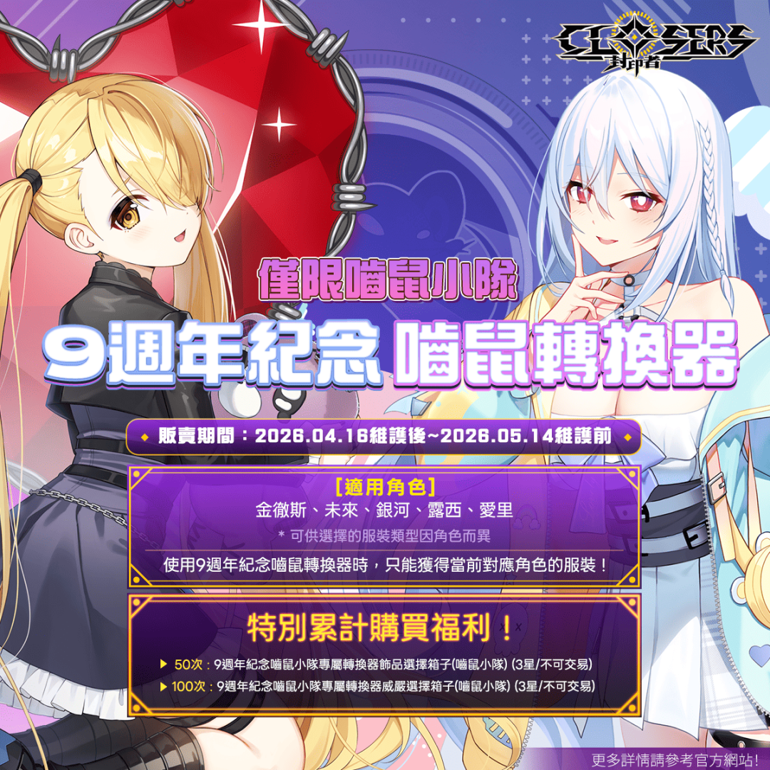 此外,「9週年紀念每日副本通關」活動同步開放,玩家透過挑戰指定副本並完成每日任務,即可穩定取得各式養成資源,提升角色戰力,打造更完整的培育循環。同時推出的「9週年紀念嚙鼠轉換器」,則提供玩家獲得珍稀時裝的機會。透過轉換機制,有機會入手多樣限定外觀,為角色增添更多個性化選擇,也提升整體收藏價值。