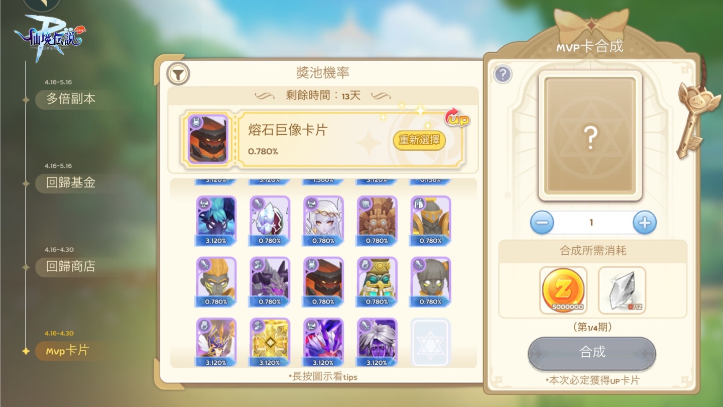 整體活動總計提供價值超過7,000萬Zeny的獎勵與養成資源,玩家亦可自選暫離期間錯過的MVP卡UP活動,並透過保底機制快速取得關鍵卡片,加速角色養成進度。
