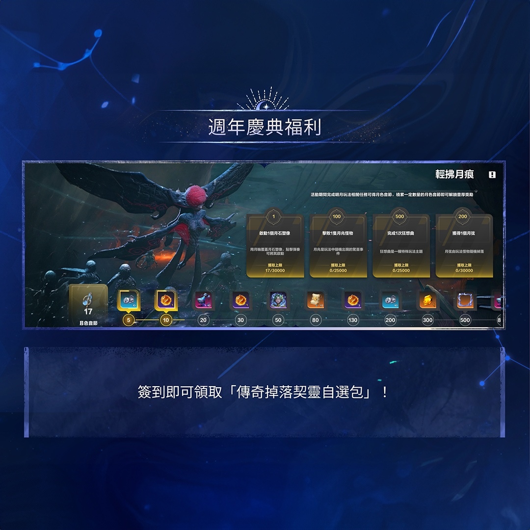 在本次三週年賽季中,玩家可前往「月下點金」活動頁面完成指定任務,累積點金次數並參與抽獎,有機會獲得三週年紀念金鈔。此外,活動過程中亦可取得碎裂原晶、約娜稅券與契靈結晶等多項養成資源,讓刷圖過程不僅累積點金進度,也同步提升角色實力。
