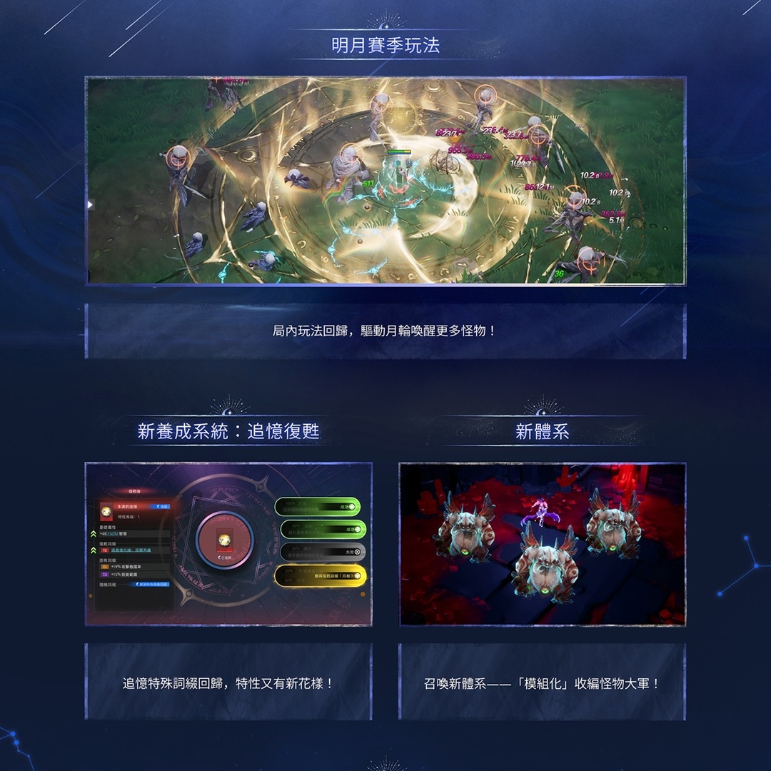 本次【明月狂想曲】賽季推出使用靈藥的全新英雄-藥香師.賽琪,並且推出全新局內玩法與養成系統,搭配追憶復甦擴展流派體系,打造更自由的刷圖體驗;同時推出週年與新手多重福利,以及多項系統優化調整,全面提升整體遊玩節奏與體驗。