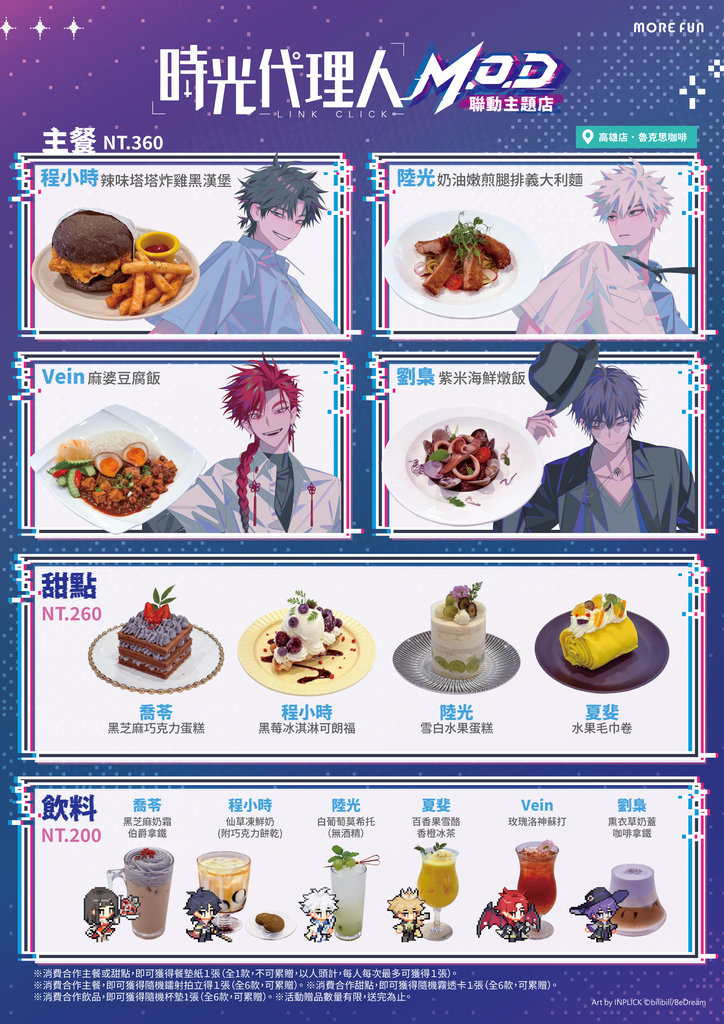 本次聯動以《時光代理人》四週年音樂企劃「M.O.D」為主題,結合六位人氣角色形象打造專屬特色餐飲,例如呼應陸光白髮與冷靜理性氣質的「雪白蛋糕」、展現 Vein 唐人商會背景與鮮明個性的中華風料理「麻婆豆腐飯」,喬苓喜愛的奶茶也融合髮色加入「黑芝麻奶霜」等等,讓粉絲在品嚐美味餐飲的同時,也能感受角色魅力。