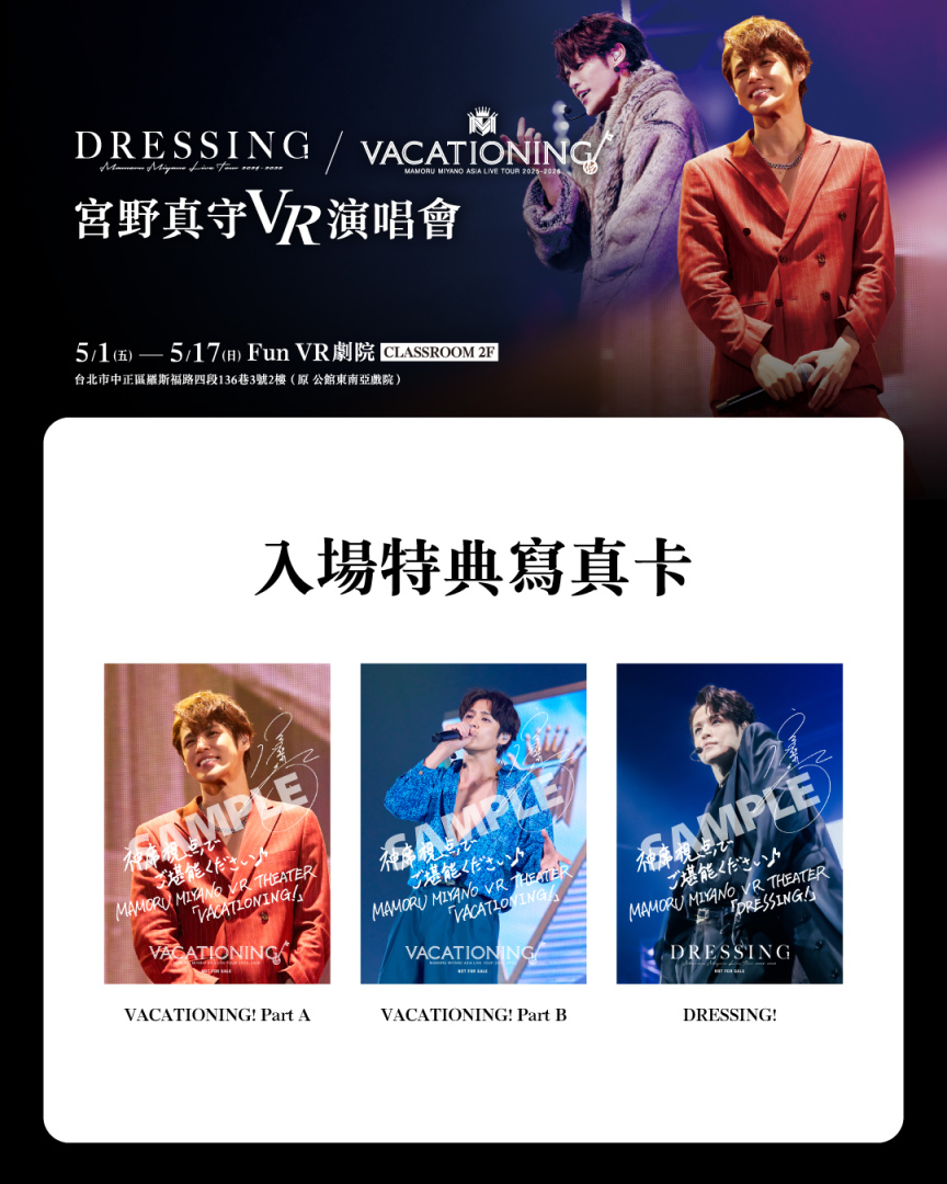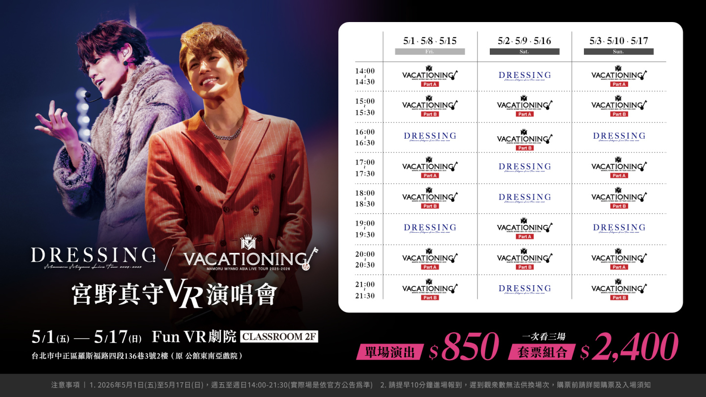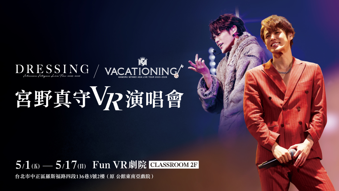 由聯合數位文創策畫台北公館「Fun VR劇院」,5月將推出最新強檔VR演唱會節目,本次邀請在台極具高人氣的日本聲優-宮野真守,作為本月首波主打,與日本攜手合作,同步於5月1日起至5月17日推出《VACATIONING!》、《DRESSING!》兩場演出版本,重現他在 2025 年 12月13日在神奈川橫濱競技場舉辦的《VACATIONING!》經典曲目。宮野真守被粉絲譽為「聲優王子」不僅多次來台舉辦演唱會,且幾乎場場完售,讓他對台灣印象相當深刻,這次得知VR作品將來台,也特別提前於官網火速公告,呼籲粉絲千萬別錯過。