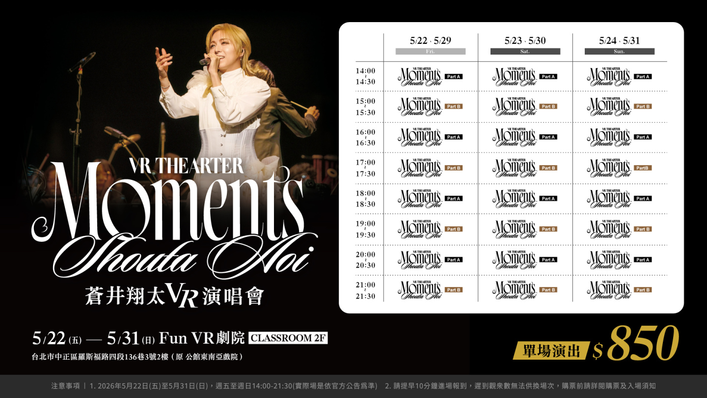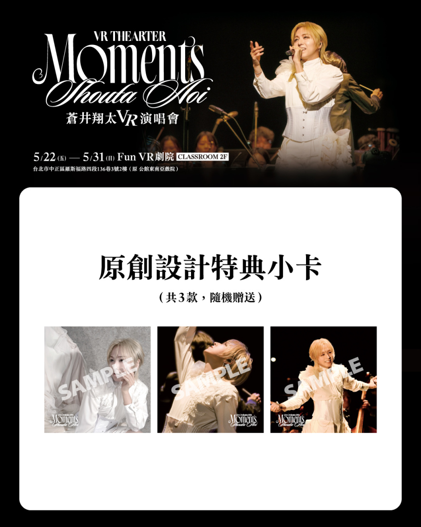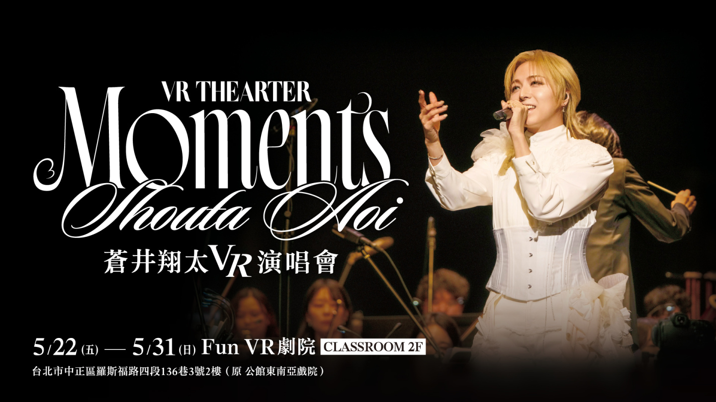 5月第二梯接棒聲優則由素有「怪物級聲優」美譽的蒼井翔太出場,5/22起至5/31將推出《蒼井翔太 VR THEATER Moments》演唱會,將《蒼井翔太 LIVE Orchestra 2026 Moments》東京•立川 Stage Garden Day1 精彩曲目VR化,蒼井翔太絕美高音聲線獲得大量粉絲讚譽為最不科學的中性美聲,這次更破天荒首次結合管弦樂,將演唱會規格豪華升級。