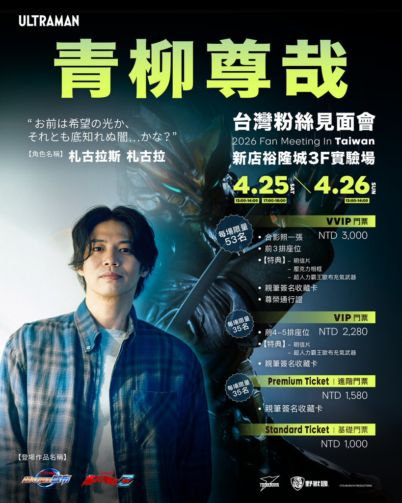 本次見面會不僅能近距離見到青柳尊哉本人,更規劃了誠意十足、陣容強大的合影環節。除了藝人本人之外,活動現場還將有粉絲熟悉的 敵對角色札古拉斯札古拉,以及超人力霸王歐布、超人力霸王傑特一同現身,讓每一場合影都更具紀念價值。無論是角色魅力、舞台氣場,或是現場互動的震撼感,都將成為粉絲不可錯過的珍貴回憶。