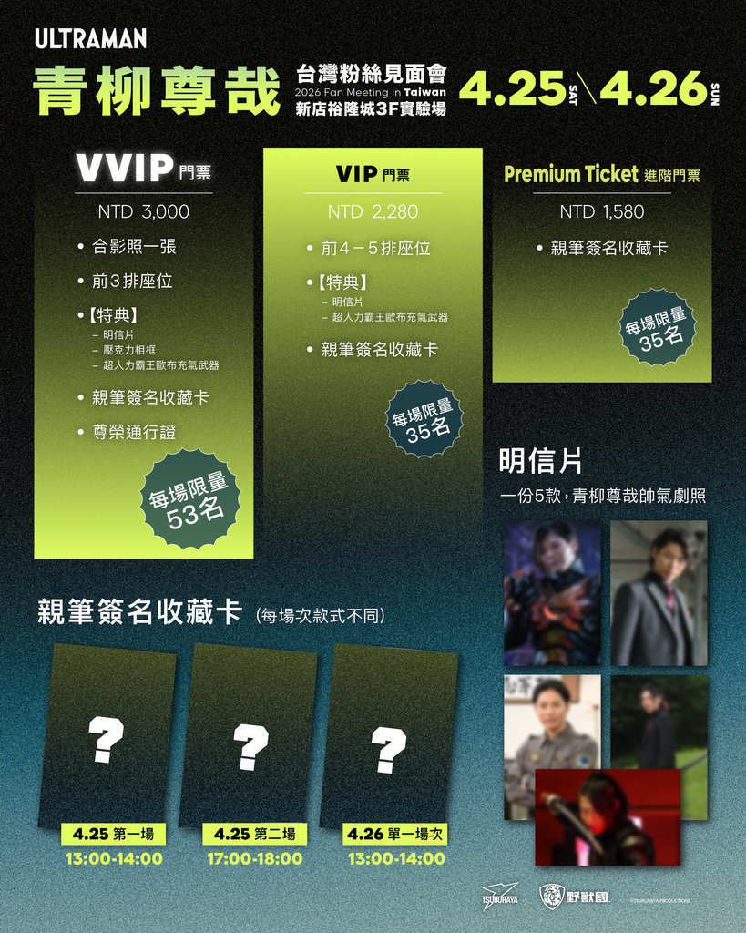 此外,活動特典中的明信片共計5款青柳尊哉劇照,而親筆簽名收藏卡則為每場次不同款式,更增添收藏價值。整體活動內容豐富,從見面互動、限量特典到豪華合影陣容,皆展現本次台灣粉絲見面會的高規格與誠意,勢必將成為《超人力霸王》系列粉絲今年最值得期待的重要活動之一。門票每款每人限購4張,單場最多購買16張,名額有限,售完為止。更多活動資訊,請持續鎖定超人力霸王官方粉絲專頁。