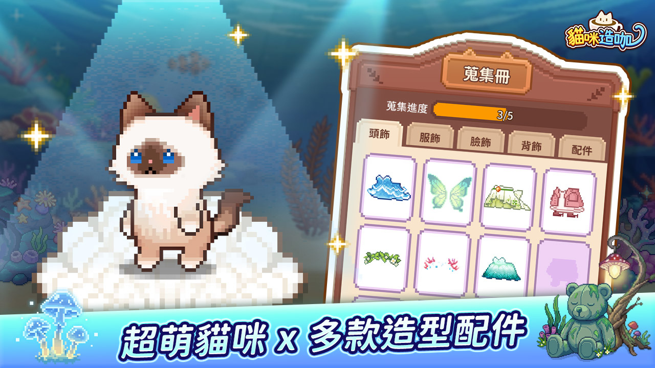 咖啡廳擴建當然需要更多貓貓員工!全新花色「伯曼貓」夢幻登場,清澈的水藍色眼睛配上臉部深色花紋,加上最吸睛的雪白手套毛色,絕對是店內的療癒新寵!本次改版同步推出多款主題造型配件,從精緻的珊瑚頭飾到波光閃閃的背飾,各式粉嫩藍綠色系裝扮等你收集!