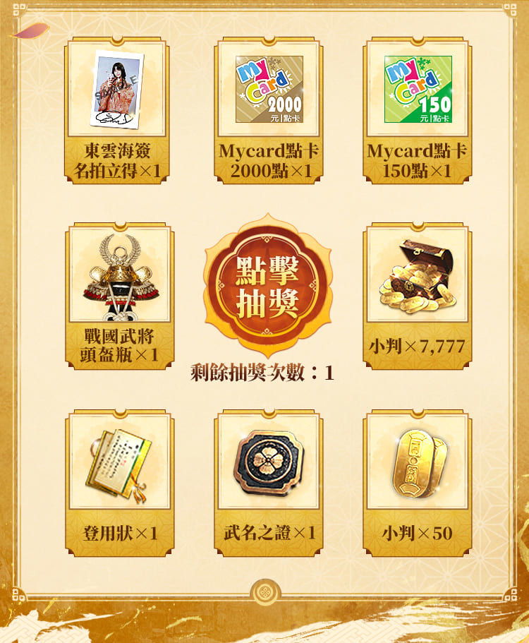 除以上活動福利之外,官方還同步加碼福利:官方粉絲團舉辦女武將紀念活動,參與即有機會獲得阿初聲優鬼頭明里及阿江聲優日高里菜簽名色紙、東雲海簽名拍立得、MyCard點數卡等珍貴實體獎勵。