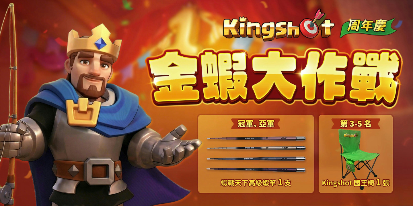 歡慶《Kingshot》全球玩家破億、臺灣用戶破百萬,周年慶活動熱度延續至5/17;除了首場「金蝦王爭奪戰」已率先於上週登場、獲得熱烈回響外,4/25也將於臺中接力開打,祭出釣蝦界夢幻逸品「蝦戰天下 SPEED 競速蝦竿」、《Kingshot》國王椅、品牌趣味周邊等豐富好禮,持續為這場北中南連動的跨界合作增添話題。