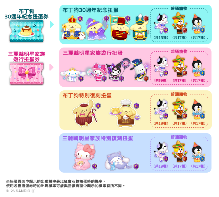本次合作活動期間內,三麗鷗明星家族人氣肖像「布丁狗」、「帕恰狗」、「大耳狗喜拿」、「酷洛米」和「美樂蒂」都將化身為「合作活動限定寵物」在高級扭蛋中登場!透過達成遊戲中各種合作活動任務獲得的「保證合作寵物扭蛋券」可用來轉高級扭蛋!獲得獎勵的條件等詳細資訊,請至遊戲內公告確認。快把握機會讓「三麗鷗明星家族」的肖像們成為你的過關夥伴,一起在遊戲中闖關吧!