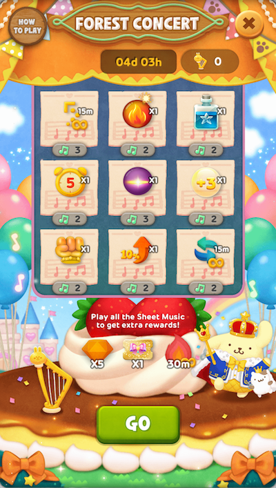 在活動期間內,只要通過一般新關卡即可獲得1個「樂器(豎琴)」,使用獲得的樂器即可挑戰取得樂譜中的道具,成功挑戰後便可以獲得相對應的活動獎勵喔!