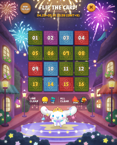 在活動期間內,以賓果遊戲方式,點選覆蓋的卡片進入活動關卡,把卡片全部翻開後即通關,通過所有關卡即可獲得獎勵!翻到幸運卡片時,也可以在過關後獲得幸運卡片獎勵,若翻開的卡片是超級幸運卡片,不用挑戰該關卡即可直接過關!如果搶先完成卡片賓果活動還能獲得搶先過關獎勵!