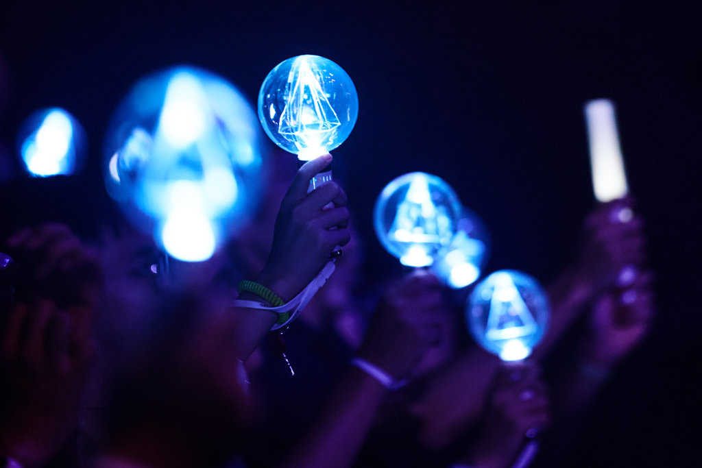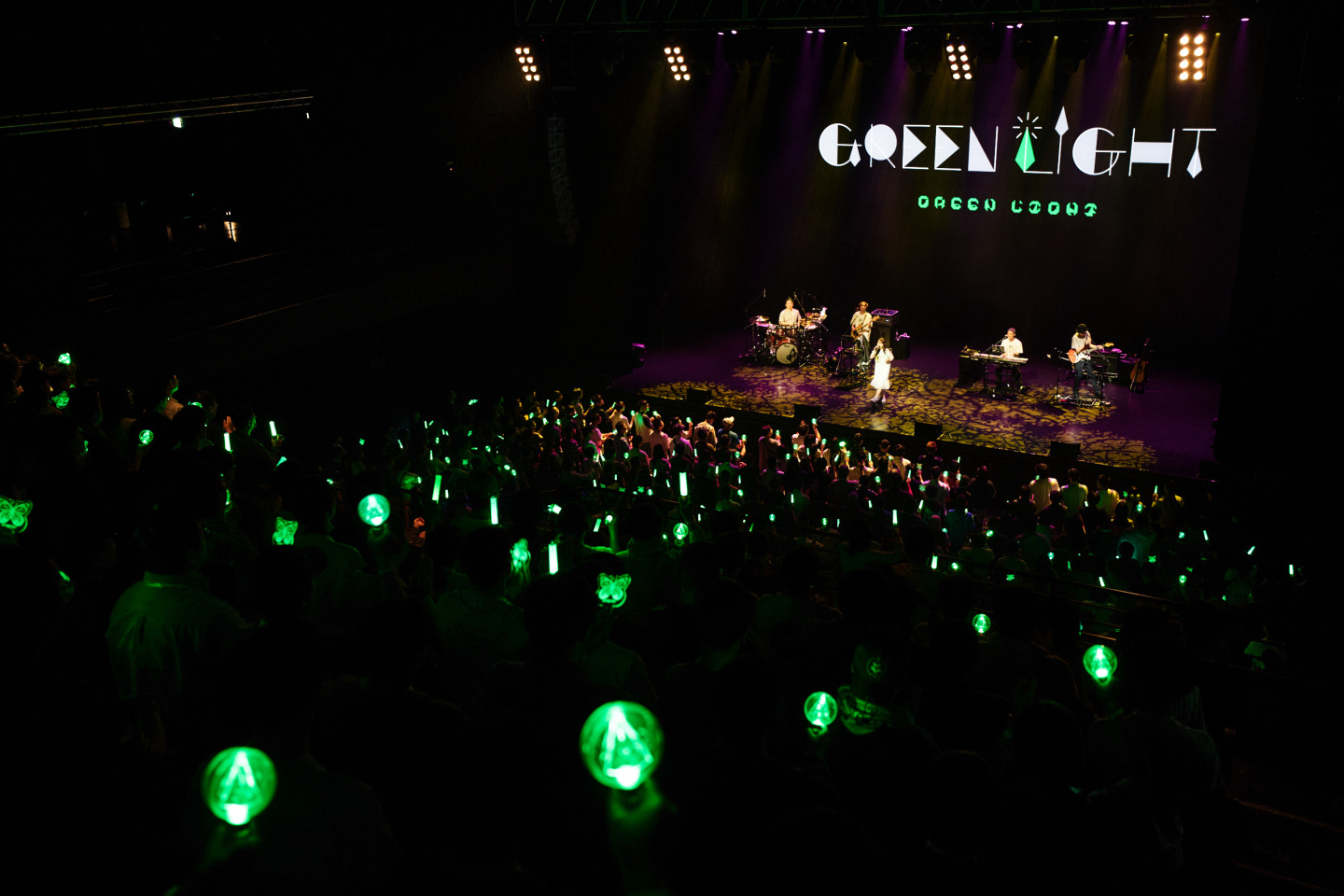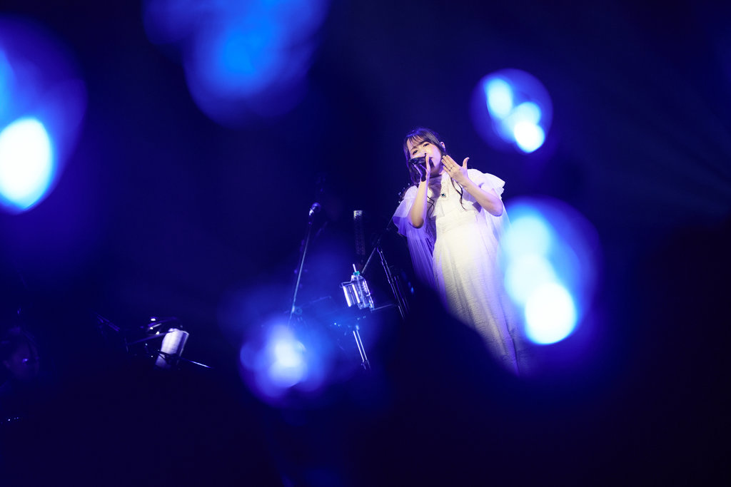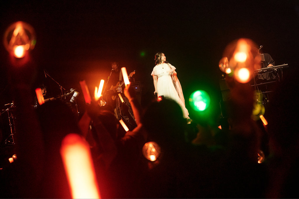 後段則透過〈Before I Rise〉、〈Aquaterrarium〉等經典作品轉為內斂鋪陳,配合故事發展呈現較為抒情的情節。「下一首歌也請大家跟我一起亮晶晶吧!」在yanaginagi的邀請下,全場歌迷齊舉手燈,於漆黑的會場中點亮一片柔和的璀璨光海,與舞台背景的翠色巨型原礦影像相互呼應,彷彿一同照亮並推進整段故事的前行。