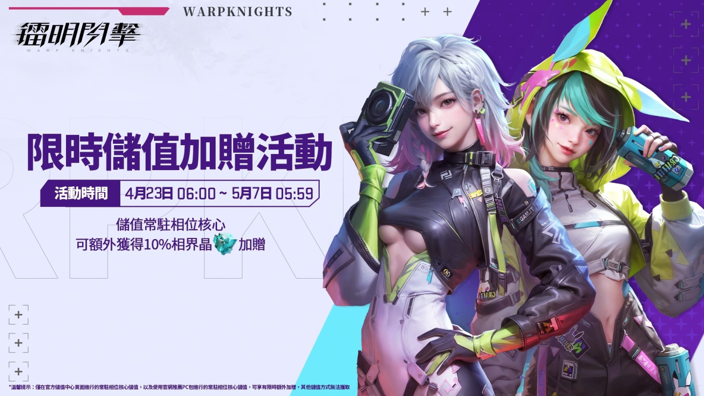 官方更是同步開啟官網限時儲值加碼活動。活動期間於官網購買常駐相位核心,除了原本 5% 相界晶回饋,再加碼額外 5% 相界晶,總回饋直接拉滿到10%。美美的角色不僅療癒你心情,還幫你荷包直接回血,絕對不能錯過!更多關於《鐳明閃擊》的遊戲資訊和福利活動,敬請關注官方網站和官方粉絲專頁。希望永續,為世界而戰,一起對抗無盡的末日吧!