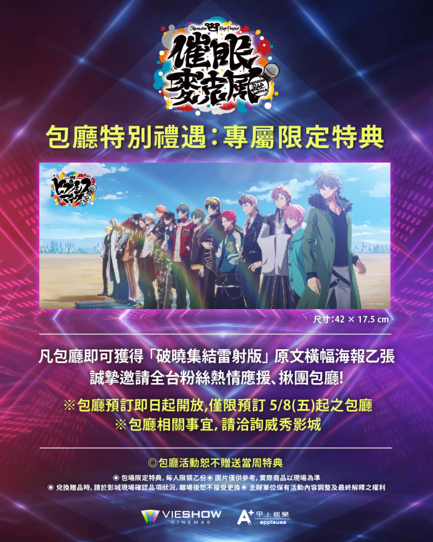 為了讓全台各 Division 粉絲能盡情享受應援樂趣,威秀影城即刻開啟「揪團包場預訂」服務,可申請5月8日 (週五) 起之包場。由於電影具備即時投票機制,包場不僅能與志同道合的戰友們共享 Live 現場的熱血,更能集結全場力量,鎖定支持隊伍的獲勝路線,親自解鎖心中所屬的最終結局。凡參與揪團包場的粉絲,即可獲得限定特典「獨家劇照橫幅海報」,尺寸為 42cm x 17.5cm, 圖面集結 18 位超人氣角色在破曉光芒中一字排開,展現決一死戰的磅礡氣勢,是粉絲絕不能錯過的收藏逸品。邀請全台粉絲即刻號召戰友、揪團包場,用你們的手機與吶喊聲,為心儀的隊伍拿下一場漂亮的勝仗!