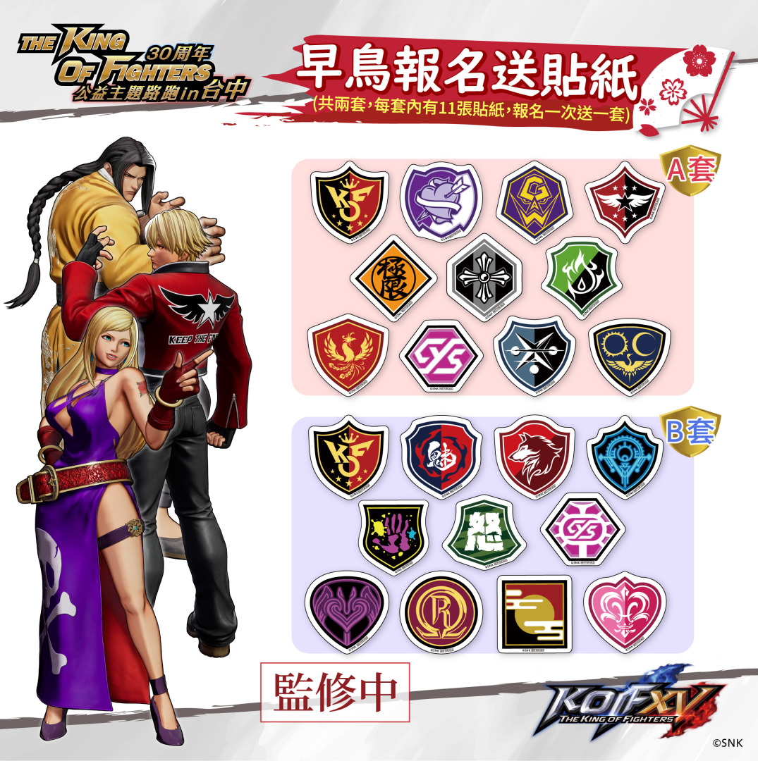 坤翔國際宣布,取得SNK ASIA授權的經典格鬥遊戲《THE KING OF FIGHTERS XV》拳皇30週年公益主題路跑,今年七月將於台中正式登場!歡迎全台拳皇迷們一起組隊報名參加這一年僅此一場的活動,現場除了邀請KOF電競好手蒞臨現場跟參賽者PK,還有展示SNK歷年經典遊戲資料,並能跟知名Coser一起拍照留念,另外會後還有抽選多項紀念商品讓您帶回家,當然也有SNK周邊商品首次販售喔!
