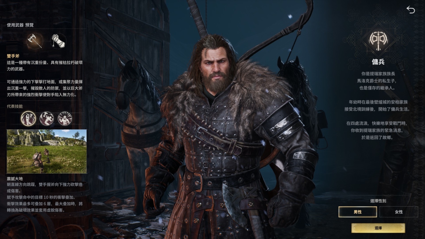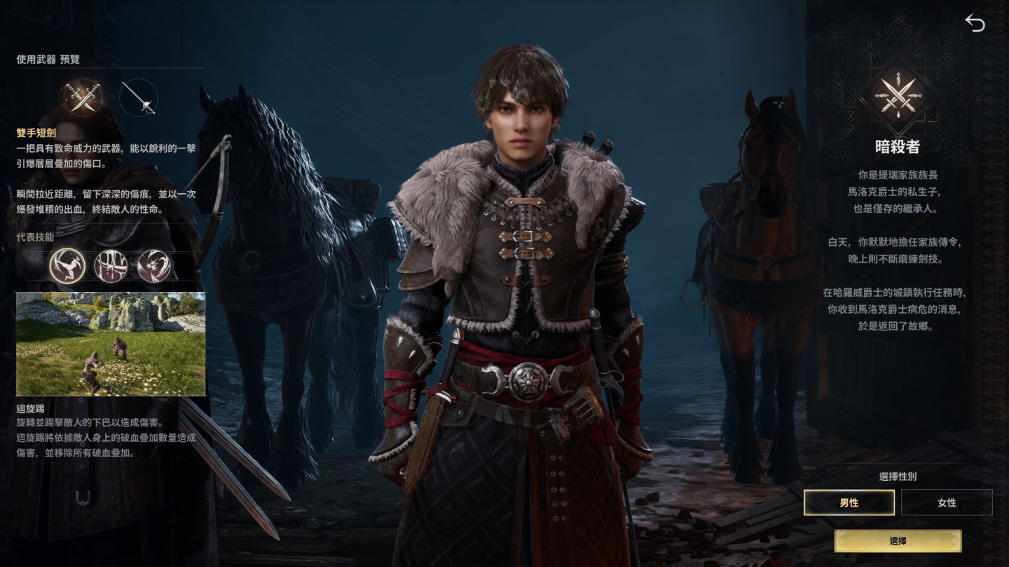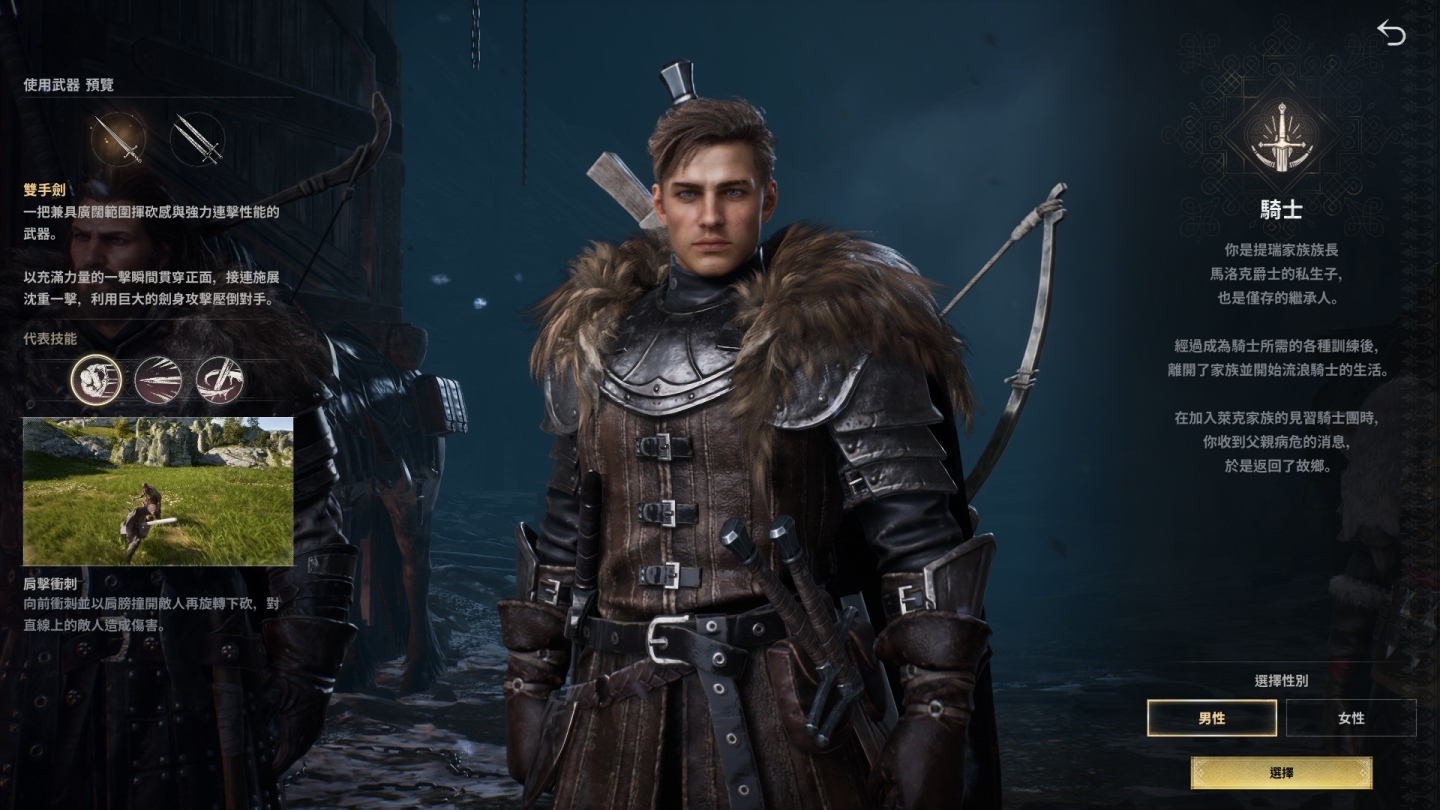 玩家在進入遊戲世界後,可以從騎士、傭兵、暗殺者三種職業當中做選擇,每種職業都有兩種擅長的使用武器可以自由切換,搭配不同的技能可以打造屬於自己的戰鬥風格。騎士可透過雙手劍和雙劍兩種武器,實現兼具範圍揮砍感以及強力連擊性能的攻擊模式,傭兵則依靠身材和力量優勢,揮舞雙手斧和護手的狂暴打擊讓你成為戰場上的破壞者,暗殺者則能自由切換雙短劍和西洋劍,展現出重視速度和精準打擊的打法,筆者這次選擇了攻防兼具的騎士進行遊戲。