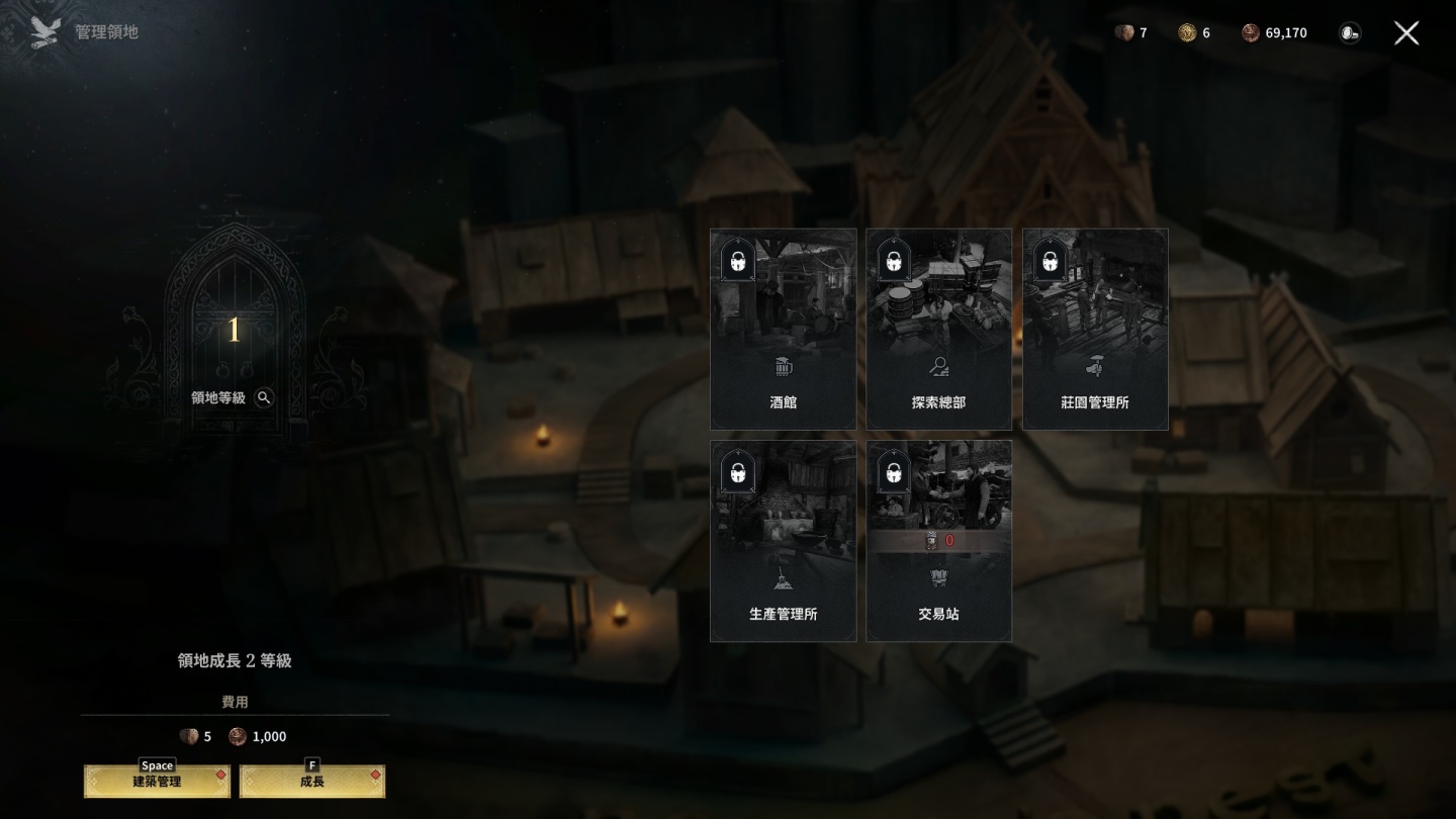 此外身為一個領主的繼承人,對於領地的管理也是很重要的,隨著遊戲進行會解鎖「管理領地」這個項目,領地中有各種不同的設施可以靠提升領地等級解鎖,其中的「探索總部」可以派遣手下和從酒館雇來的工人去不同地點探索獲得資源,工人也能安排到生產管理所去生產資源,其他像是製藥工坊或鐵匠鋪等製作系設施也能靠領地等級的提升讓可製作物品以及欄位增加。