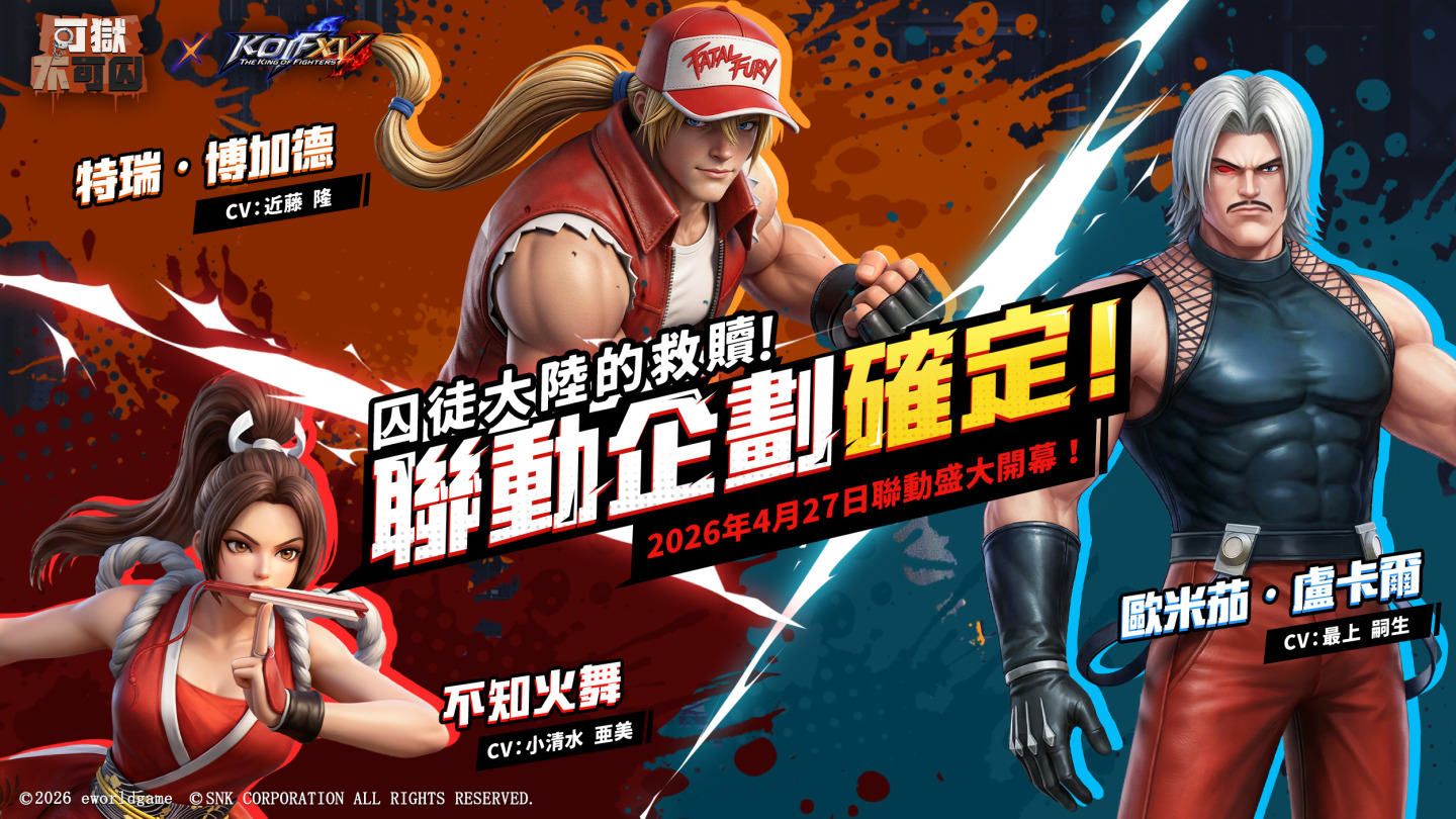 由Eworld Game發行的人氣模擬經營 & 策略融合手遊《可獄不可囚》,與《拳皇XV》的聯動活動於4月27日(週一)正式啟動!經典角色「不知火舞」「特瑞・博加德」「歐米茄・盧卡爾」限時登場,將為各位典獄長帶來全新劇情與豐富體驗!