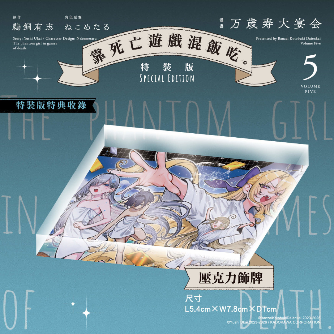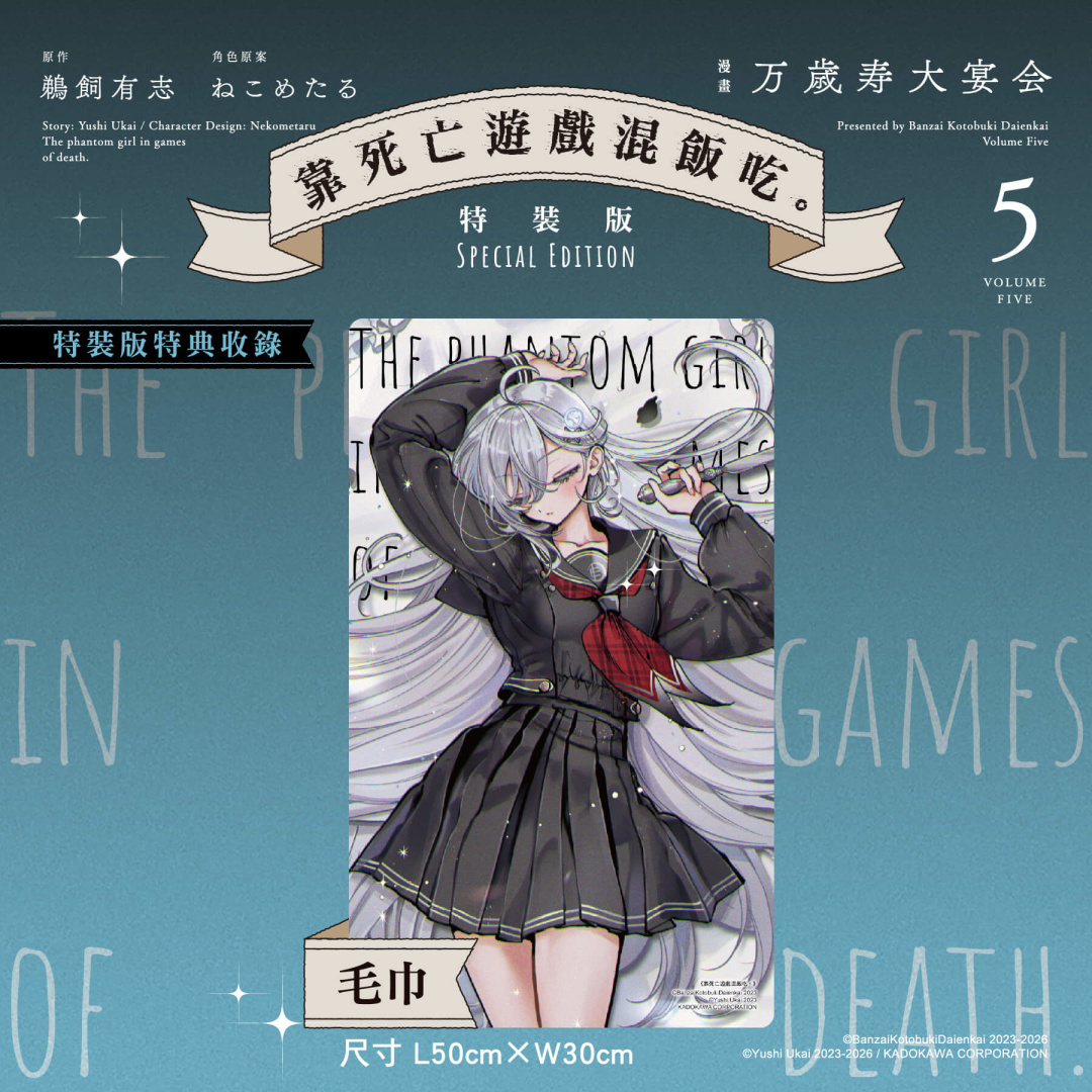 漫畫《靠死亡遊戲混飯吃 (5)》以宿敵重逢的經典劇情《GOLDEN BATH》幽鬼與御城大小姐的激烈浴池戰鬥場面為主題,規劃特裝版收錄多款特典:「壓克力飾牌」質感透亮壓克力材質展現角色層次,完美呈現精彩對決名場面、「幽鬼JK制服Ver.毛巾」以高品質親膚纖維搭配細緻印刷工法,身著女高中生制服的幽鬼絕美睡顏值得珍藏!特典與「本集漫畫with首刷小卡」皆收錄於「特裝版珍藏書盒」。自即日起於台灣角川官網及全台指定通路開放預購,期間至 5/7(四) 23:39 為止。凡於官網完成預購者,加碼贈送滿額優惠券100元(每會員限使用/領取乙次,使用期限為60天),另可額外獲得限定特典「官網獨家!膠捲書籤」乙份,書籤採用半透明 PET 材質,模擬電影膠捲的質感,極具電影感與藝術張力。有意者還請把握預購機會,以免向隅。