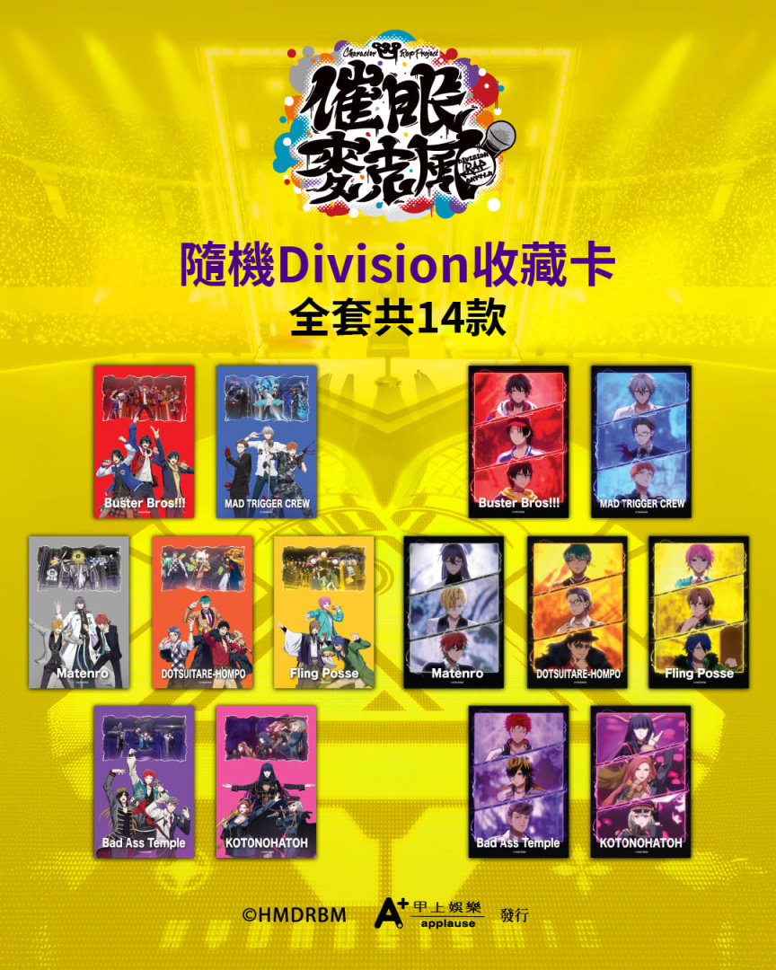 此外,「專屬抽卡機台」 也已正式進駐 10 家指定威秀影城,將於 4/29 上映當天同步啟動,提供「隨機角色收藏小卡(共 21 款)」與「隨機 Division 收藏卡(共 14 款)」,讓粉絲在進影廳前能先抽卡集氣,把最愛的本命帶回家!凡購買《催眠麥克風》4/29(三) 至 5/7(四) 期間之電影票一張,即可兌換領取首週限量特典「主視覺 A3 海報(UV增豔版)」一張。該海報採用高規格「0.35mm 鑽卡」與特殊「UV增豔四色印刷」及「互斥油」 工藝,展現如同精品般的磨砂顆粒質感與層次光澤,絕對是粉絲不容錯過的紀念收藏。《催眠麥克風》4 月 29 日起正式在全台 12 家威秀影城獨家上映,首週場次熱賣中,這是一場由你說了算的戰鬥,準備好你的手機與手燈,一起加入這場改變命運的饒舌對決!