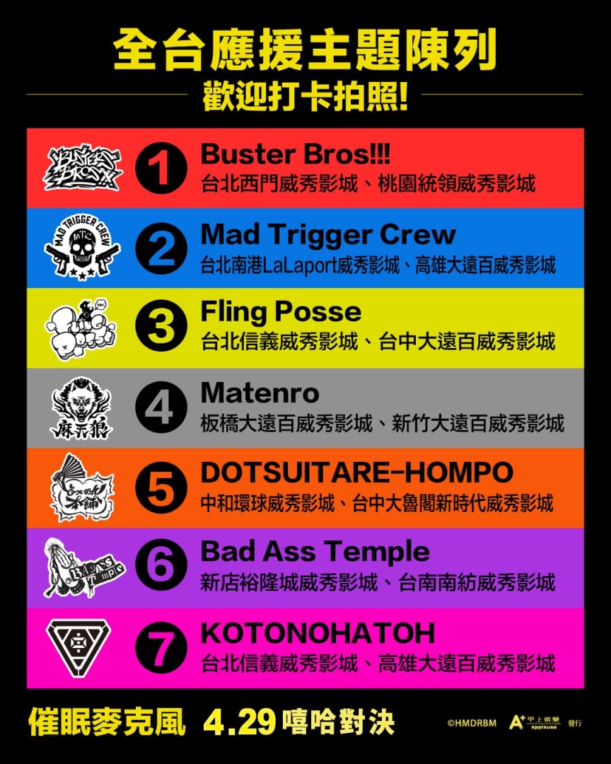 為了慶祝上片,「應援主題陳列」 已全面進駐全台威秀影城,涵蓋 7 大 Division 領地, 包括池袋「Buster Bros!!!」在台北西門與桃園統領、橫濱「Mad Trigger Crew」在台北南港 LaLaport 與高雄大遠百、澀谷「Fling Posse」在台北信義與台中大遠百、新宿「Matenro」在板橋大遠百和新竹大遠百、大阪「DOTSUITARE-HOMPO」在中和環球及台中大魯閣新時代、名古屋「Bad Ass Temple」在新店裕隆城和台南南紡,中王區「言之葉黨」在台北信義與高雄大遠百,歡迎粉絲前往拍照打卡,力挺自己的 Division!