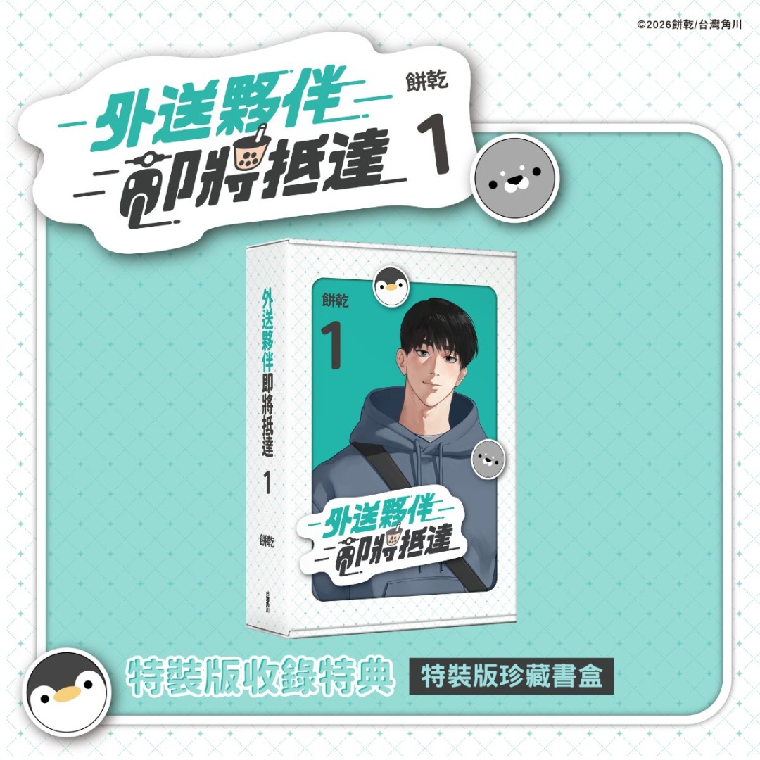 《外送夥伴即將抵達1》特裝版收錄多項限定特典,包含雙面印刷的「煒舟壓克力立牌」、肌膚吹彈可破的「匿名海豹美尻胸章」、餅乾老師新繪製的「8頁番外別冊」,以及無碼無聖光「漫畫單行本(含特典)」,以上精美周邊皆收錄於「特裝版珍藏書盒」。《外送夥伴即將抵達1》特裝版即日起開放預購,同步於台灣角川官網推出限定活動,4/27~5/31活動期間於台灣角川官網購買《外送夥伴即將抵達1》特裝版,即有機會獲得LINE WEBTOON「回饋型代幣25枚」乙組,有興趣的讀者請務必把握機會!