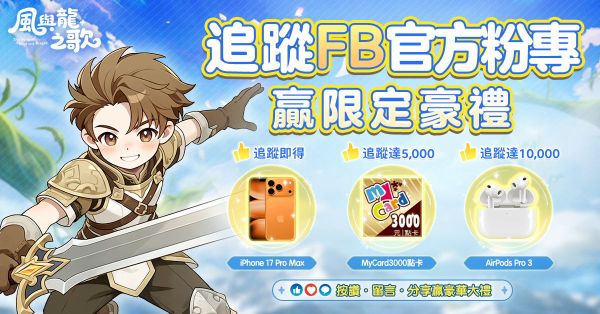 除了豐富的預約豪禮,更準備了多樣化的社群福利與冒險家們同歡!現在只需前往《風與龍之歌》官方粉專按讚並追蹤,就有機會抽得iPhone 17 Pro Max,更有MyCard 3000點數卡和AirPods Pro 3加碼抽等你帶回家。還有更多遊戲好禮將在官方FB粉專送出,各位冒險家記得追蹤FB粉專,不要錯過任何獲得秘寶的機會唷!