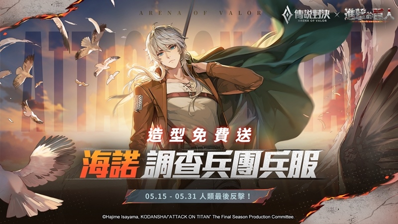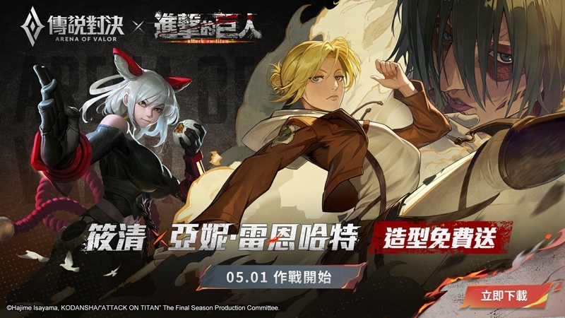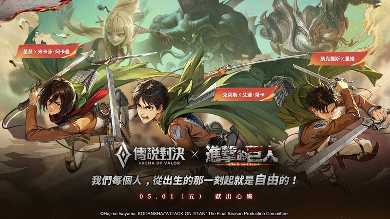 《Garena 傳說對決》五五好團節活動盛大開跑中,宣布與超人氣日本動畫《進擊的巨人》展開聯動合作。本次合作將於 5 月 1 日正式開啟,動畫中的人氣角色「艾連」、「米卡莎」、「里維」都將作為聯動造型降臨傳說戰場。